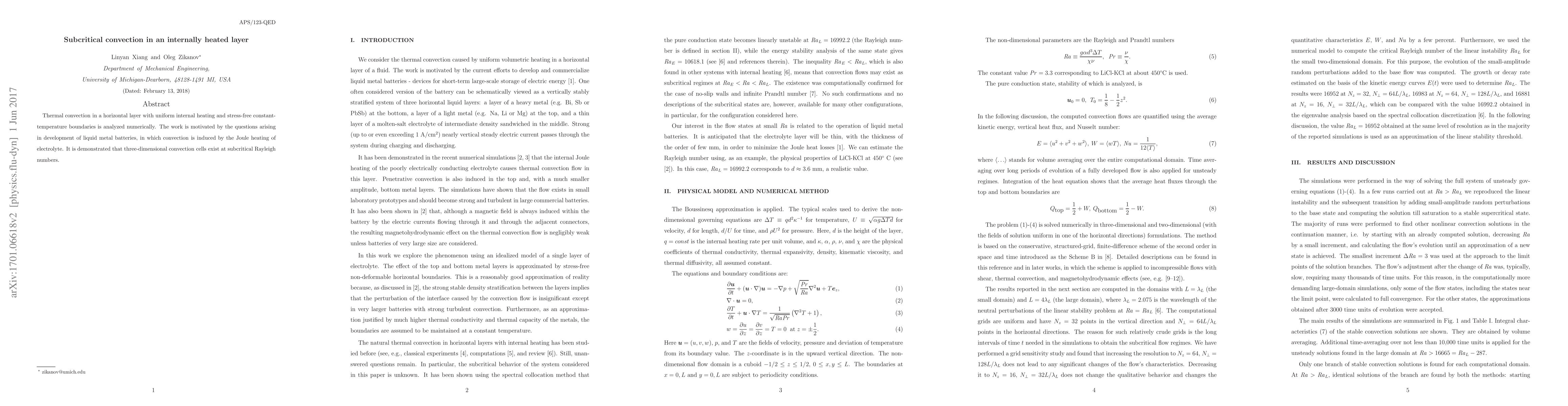 Thermal convection in a horizontal layer with uniform internal heating and stress-free constant-temperature boundaries is analyzed numerically. The work is motivated by the questions arising in development of liquid metal batteries, in which convection is induced by the Joule heating of electrolyte. It is demonstrated that three-dimensional convection cells exist at subcritical Rayleigh numbers.