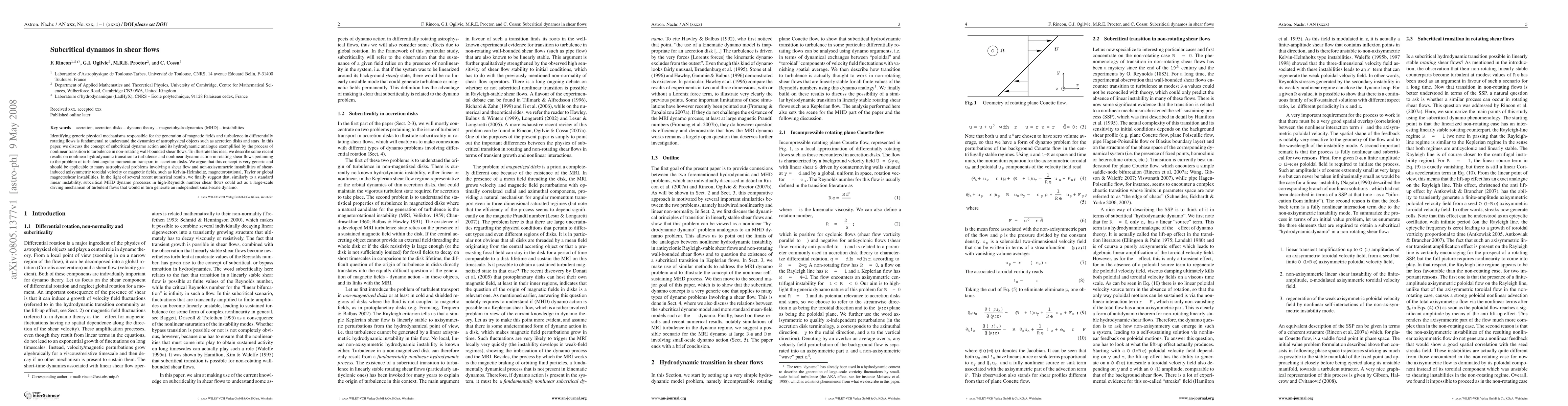 This paper explores subcritical dynamo action in shear flows, comparing it to the nonlinear transition to turbulence in non-rotating flows, and suggests its applicability to astrophysical problems involving shear-induced instabilities. It concludes that subcritical MHD dynamo processes may drive turbulent flows, generating small-scale dynamos.