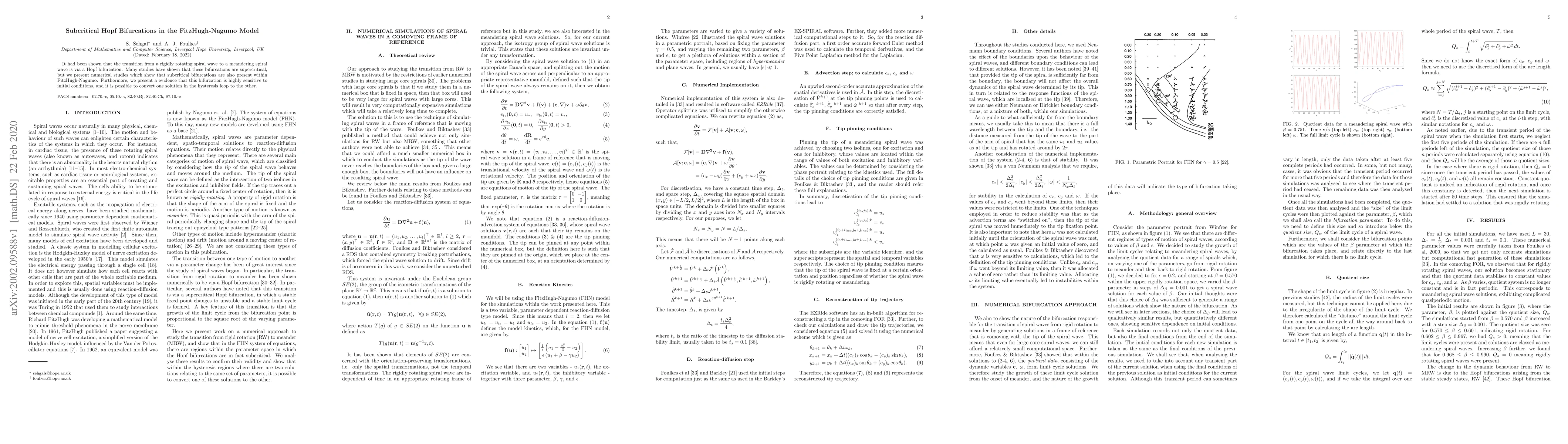 This paper investigates the occurrence of subcritical Hopf bifurcations in the FitzHugh-Nagumo model, revealing that these bifurcations can lead to transitions from rigidly rotating to meandering spiral waves. The study demonstrates the sensitivity of these bifurcations to initial conditions, allowing conversion between solutions in the hysteresis loop.