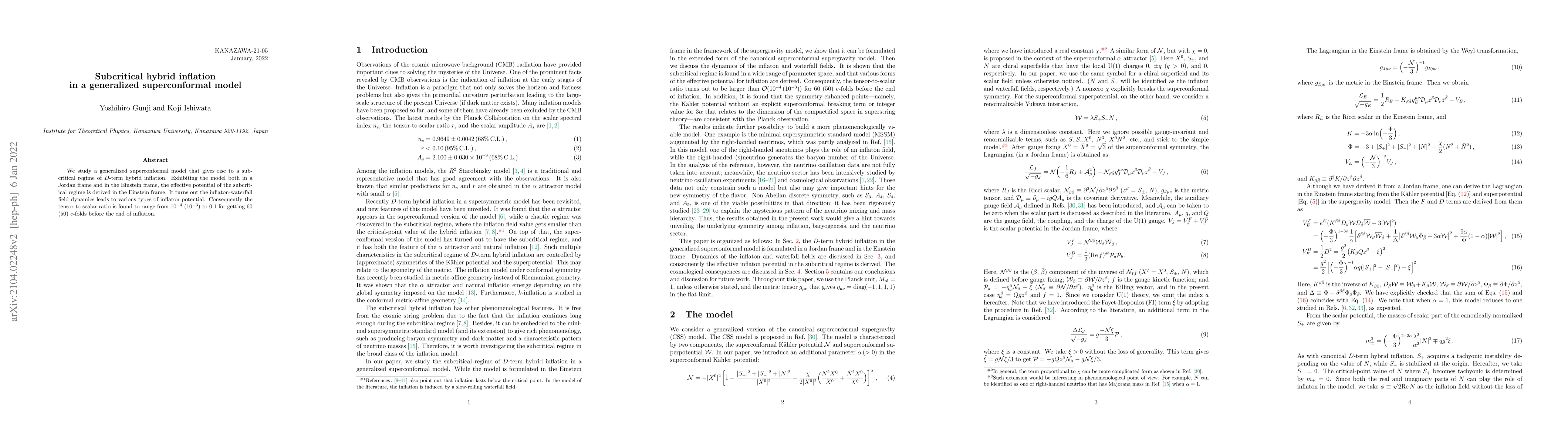This paper explores a generalized superconformal model that supports subcritical hybrid inflation, deriving the effective potential in the Einstein frame. It finds that the inflaton-waterfall field dynamics yield diverse inflaton potentials, resulting in a tensor-to-scalar ratio ranging from $10^{-4}$ to $0.1$ for achieving 60 or 50 $e$-folds of inflation.