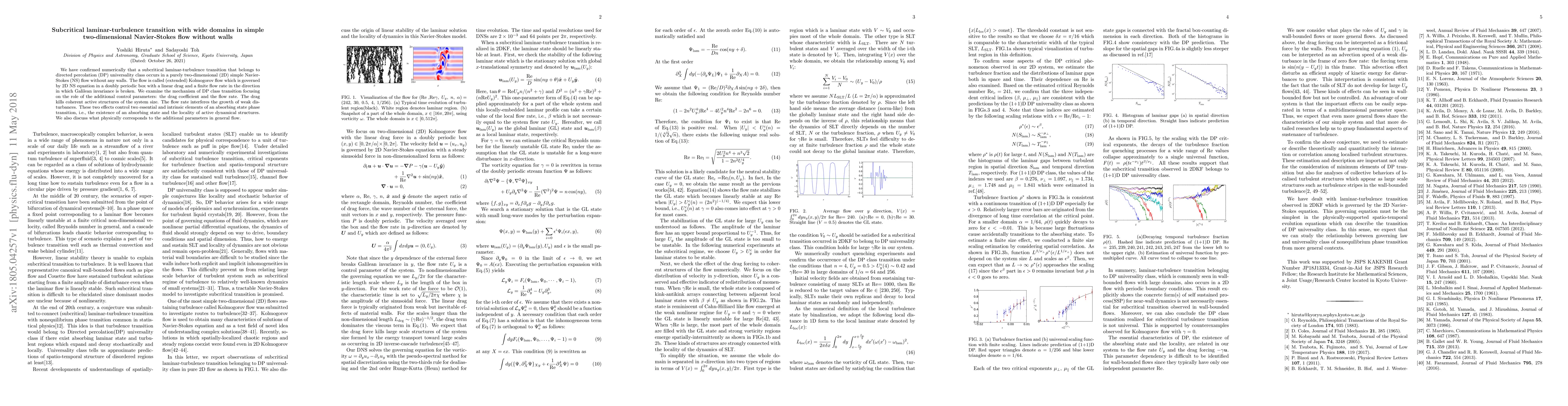 This paper numerically confirms a subcritical laminar-turbulence transition in a two-dimensional Navier-Stokes flow without walls, identifying it as a directed percolation transition. The study examines the influence of drag coefficient and flow rate on the transition mechanism, revealing their roles in controlling the existence of an absorbing state and the locality of active structures.