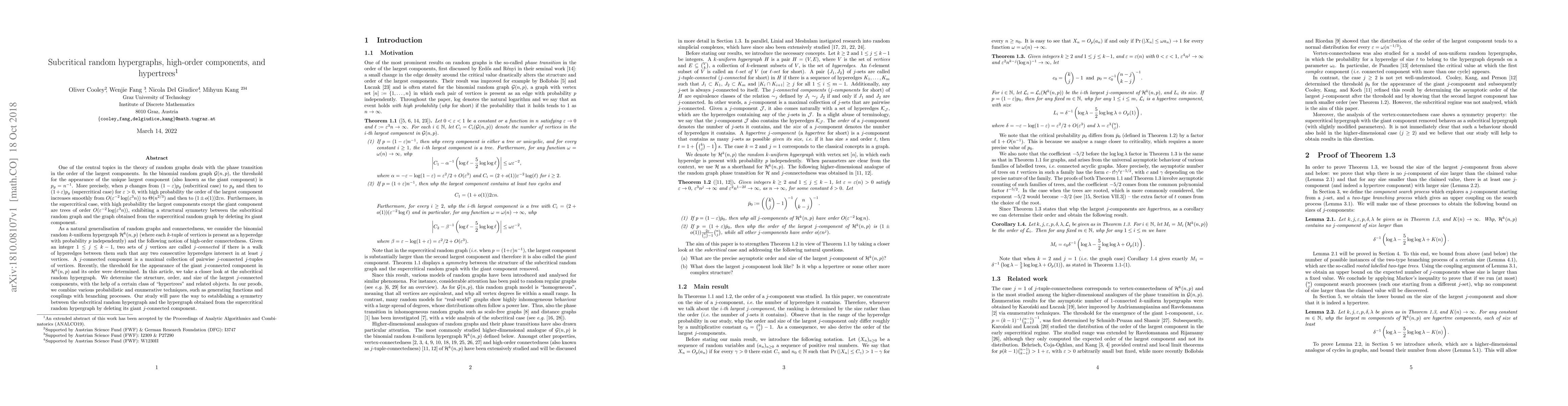 Researchers study subcritical random hypergraphs, finding that as a parameter changes from subcritical to supercritical, the order of the largest component increases smoothly, growing from $O( ext{μe}^{-2} ext{log}( ext{μe}^3 n))$ to $ ext{π}(n^{2/3})$, and then to $(1 ext{¼ o}(1)) 2 ext{μe} n$.