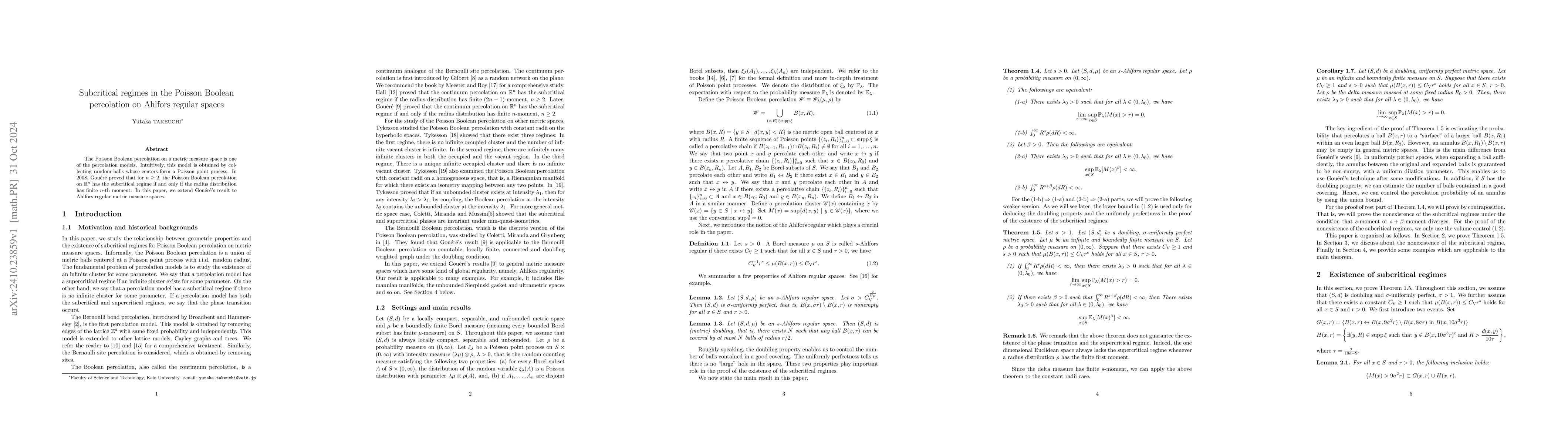 Summary: This paper extends Gouérou's 2008 result on subcritical regimes in Poisson Boolean percolation to Ahlfors regular metric measure spaces, showing that the presence of such regimes depends on the finite $n$-th moment of the radius distribution.