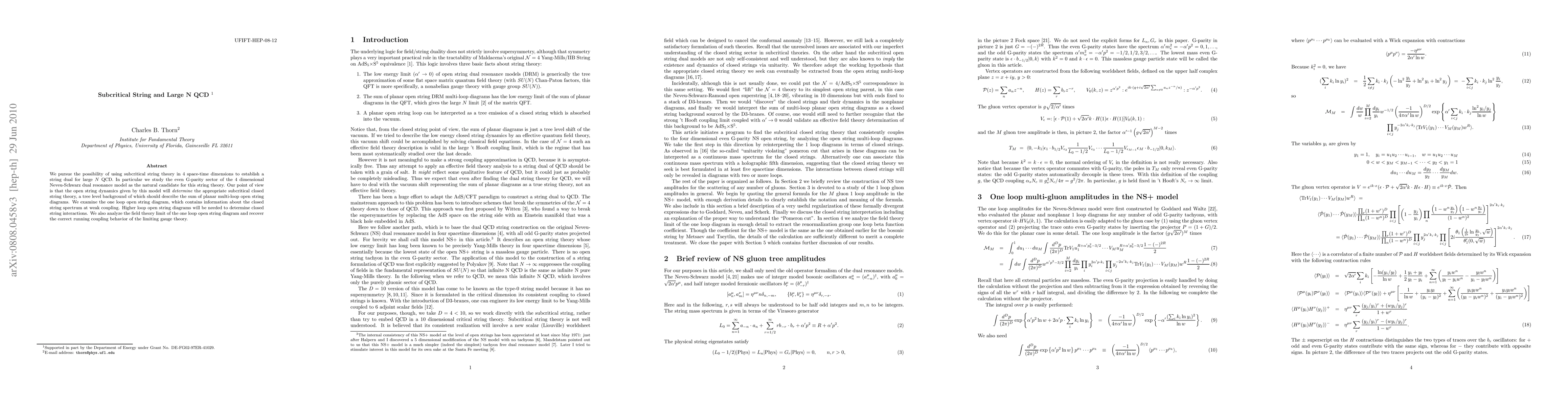 We pursue the possibility of using subcritical string theory in 4 space-time dimensions to establish a string dual for large N QCD. In particular we study the even G-parity sector of the 4 dimensional Neveu-Schwarz dual resonance model as the natural candidate for this string theory. Our point of view is that the open string dynamics given by this model will {\it determine} the appropriate subcritical closed string theory, a tree level background of which should describe the sum of planar multi-loop open string diagrams. We examine the one loop open string diagram, which contains information about the closed string spectrum at weak coupling. Higher loop open string diagrams will be needed to determine closed string interactions. We also analyze the field theory limit of the one loop open string diagram and recover the correct running coupling behavior of the limiting gauge theory.