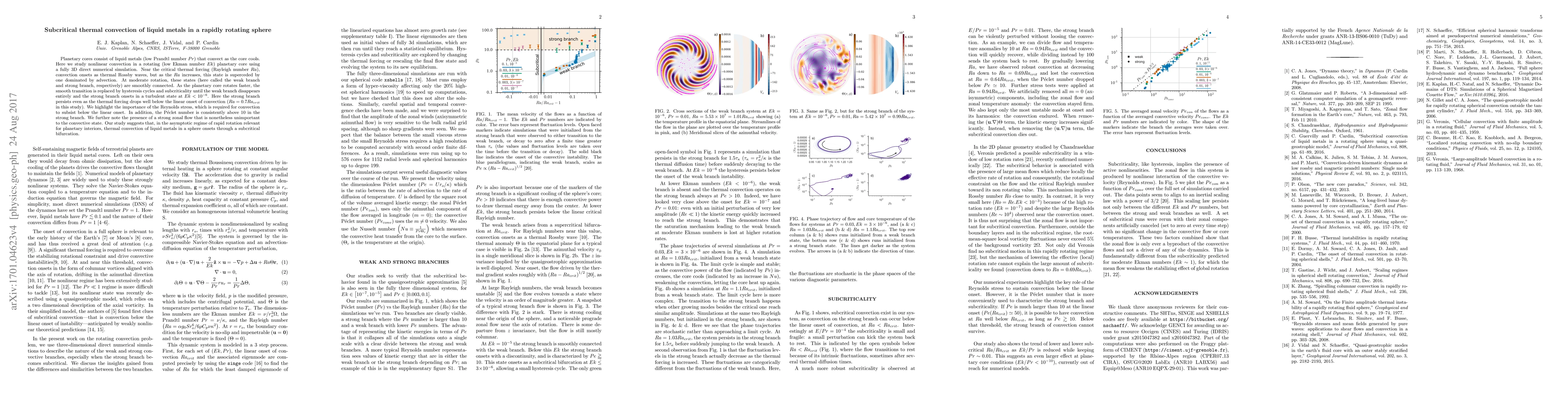 Planetary cores consist of liquid metals (low Prandtl number $Pr$) that convect as the core cools. Here we study nonlinear convection in a rotating (low Ekman number $Ek$) planetary core using a fully 3D direct numerical simulation. Near the critical thermal forcing (Rayleigh number $Ra$), convection onsets as thermal Rossby waves, but as the $Ra$ increases, this state is superceded by one dominated by advection. At moderate rotation, these states (here called the weak branch and strong branch, respectively) are smoothly connected. As the planetary core rotates faster, the smooth transition is replaced by hysteresis cycles and subcriticality until the weak branch disappears entirely and the strong branch onsets in a turbulent state at $Ek < 10^{-6}$. Here the strong branch persists even as the thermal forcing drops well below the linear onset of convection ($Ra=0.7Ra_{crit}$ in this study). We highlight the importance of the Reynolds stress, which is required for convection to subsist below the linear onset. In addition, the P\'eclet number is consistently above 10 in the strong branch. We further note the presence of a strong zonal flow that is nonetheless unimportant to the convective state. Our study suggests that, in the asymptotic regime of rapid rotation relevant for planetary interiors, thermal convection of liquid metals in a sphere onsets through a subcritical bifurcation.