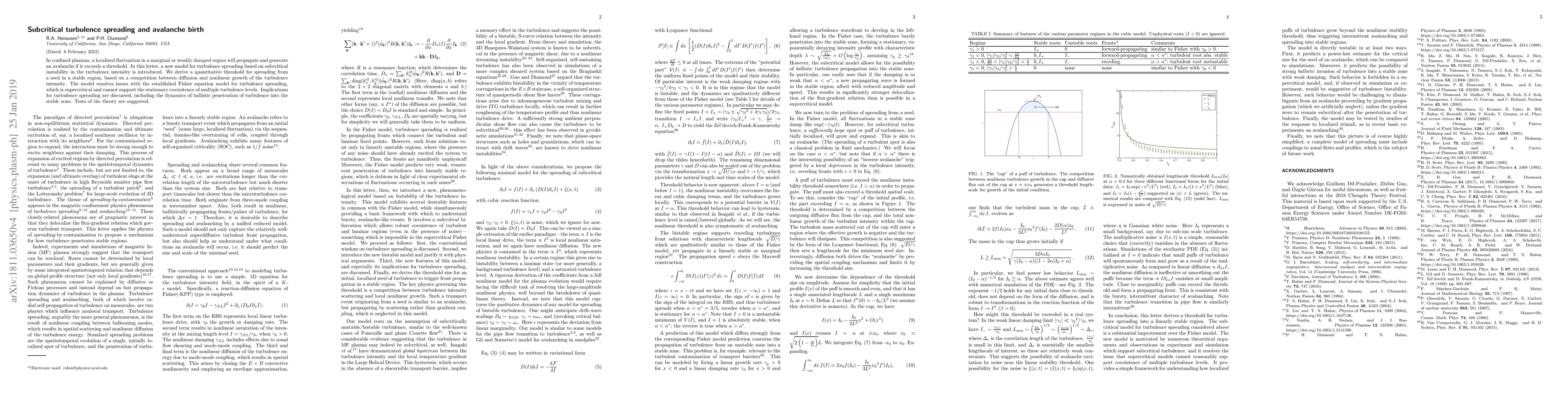 In confined plasmas, a localized fluctuation in a marginal or weakly damped region will propagate and generate an avalanche if it exceeds a threshold. In this letter, a new model for turbulence spreading based on subcritical instability in the turbulence intensity is introduced. We derive a quantitative threshold for spreading from a seed in a stable region, based on a competition between diffusion and nonlinear growth of the turbulence intensity. The model resolves issues with the established Fisher equation model for turbulence spreading, which is supercritical and cannot support the stationary coexistence of multiple turbulence levels. Implications for turbulence spreading are discussed, including the dynamics of ballistic penetration of turbulence into the stable zone. Tests of the theory are suggested.