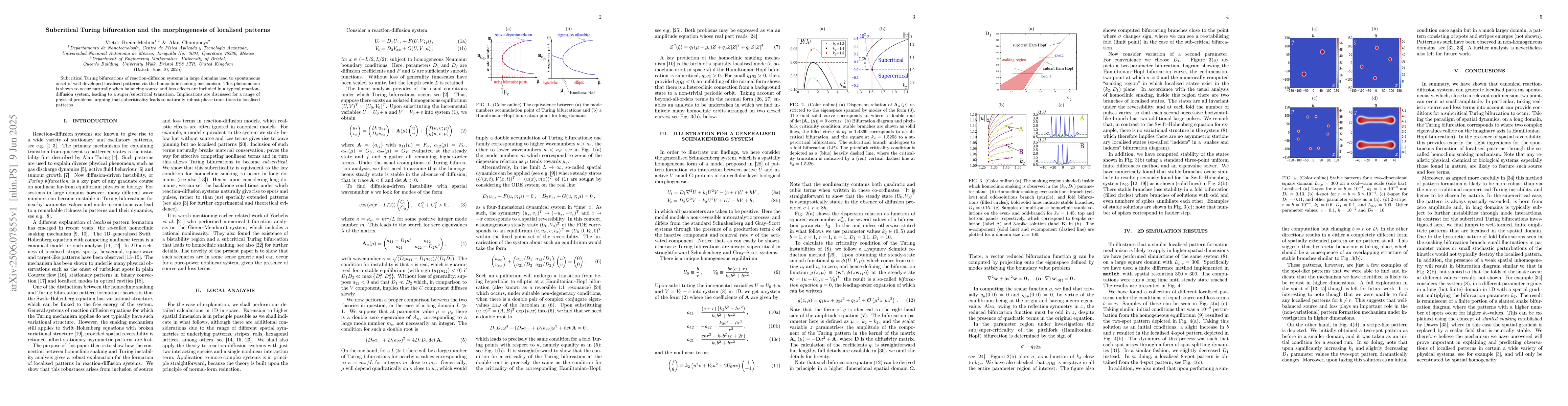 This research paper reveals that subcritical Turing bifurcations in reaction-diffusion systems can spontaneously create localized patterns through a process called homoclinic snaking, leading to naturally robust phase transitions.