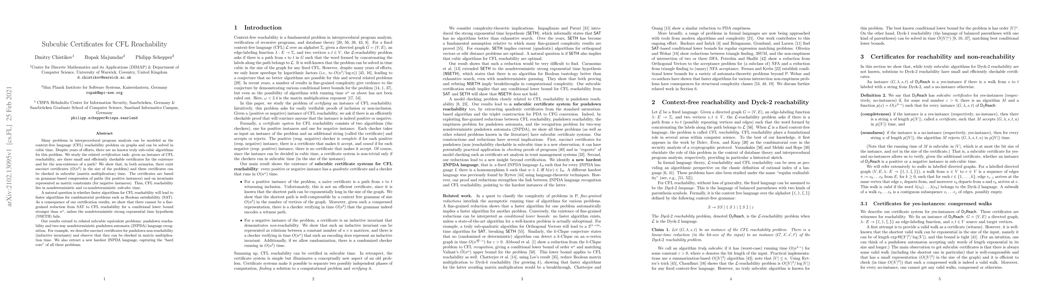 Many problems in interprocedural program analysis can be modeled as the context-free language (CFL) reachability problem on graphs and can be solved in cubic time. Despite years of efforts, there are no known truly sub-cubic algorithms for this problem. We study the related certification task: given an instance of CFL reachability, are there small and efficiently checkable certificates for the existence and for the non-existence of a path? We show that, in both scenarios, there exist succinct certificates ($O(n^2)$ in the size of the problem) and these certificates can be checked in subcubic (matrix multiplication) time. The certificates are based on grammar-based compression of paths (for positive instances) and on invariants represented as matrix constraints (for negative instances). Thus, CFL reachability lies in nondeterministic and co-nondeterministic subcubic time. A natural question is whether faster algorithms for CFL reachability will lead to faster algorithms for combinatorial problems such as Boolean satisfiability (SAT). As a consequence of our certification results, we show that there cannot be a fine-grained reduction from SAT to CFL reachability for a conditional lower bound stronger than $n^\omega$, unless the nondeterministic strong exponential time hypothesis (NSETH) fails. Our results extend to related subcubic equivalent problems: pushdown reachability and two-way nondeterministic pushdown automata (2NPDA) language recognition. For example, we describe succinct certificates for pushdown non-reachability (inductive invariants) and observe that they can be checked in matrix multiplication time. We also extract a new hardest 2NPDA language, capturing the "hard core" of all these problems.