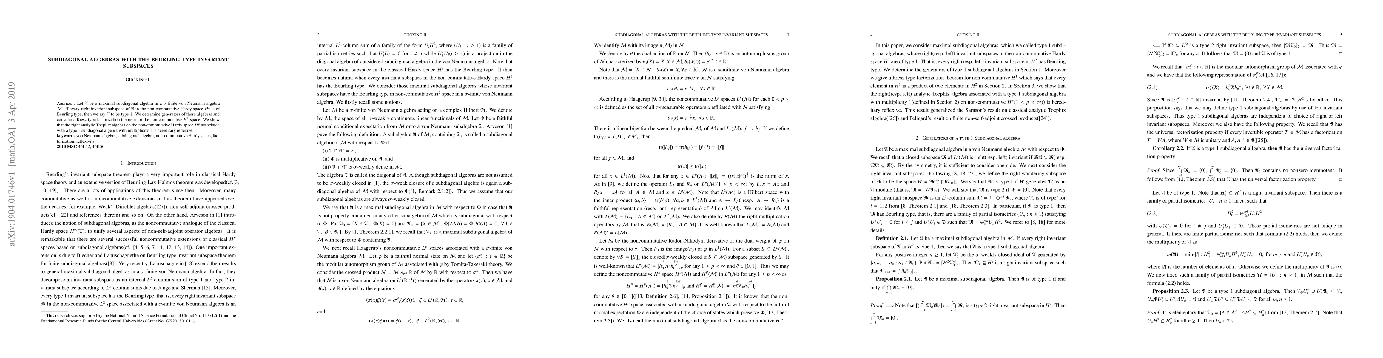 This paper investigates maximal subdiagonal algebras within $\sigma$-finite von Neumann algebras, classifying them as type 1 if all their right invariant subspaces in $H^2$ are of Beurling type. It establishes generators for these algebras and proves a Riesz type factorization theorem for the non-commutative $H^1$ space, showing that the right analytic Toeplitz algebra associated with such type 1 algebras is hereditary reflexive.