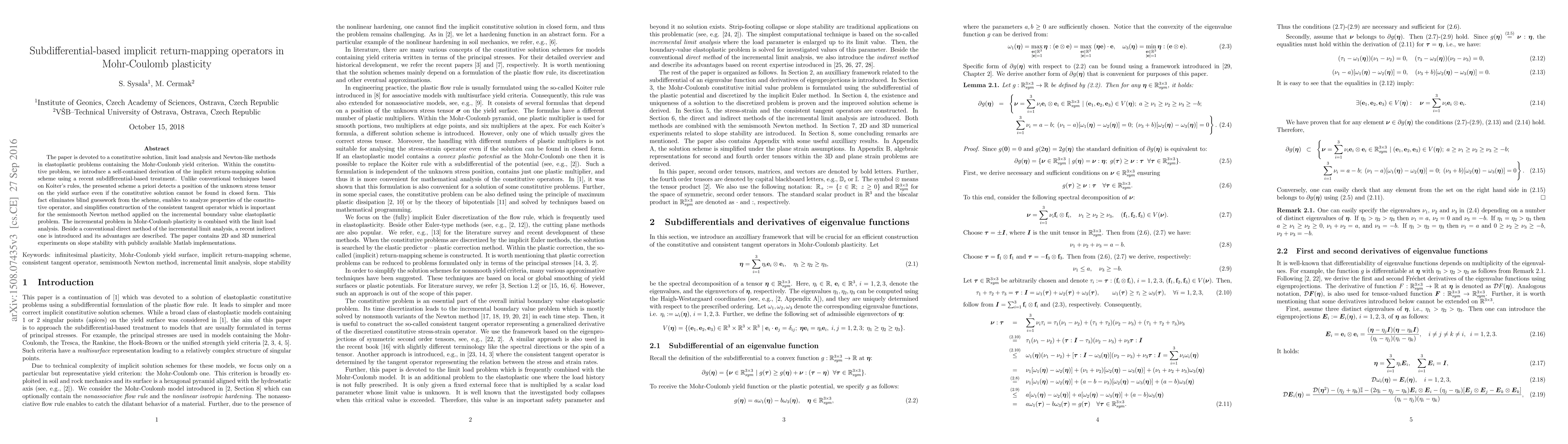 This paper develops a subdifferential-based implicit return-mapping solution scheme for Mohr-Coulomb plasticity, enabling a priori detection of stress tensor positions on the yield surface without closed-form solutions. It also introduces both direct and indirect methods for incremental limit load analysis, supported by 2D and 3D numerical experiments on slope stability.