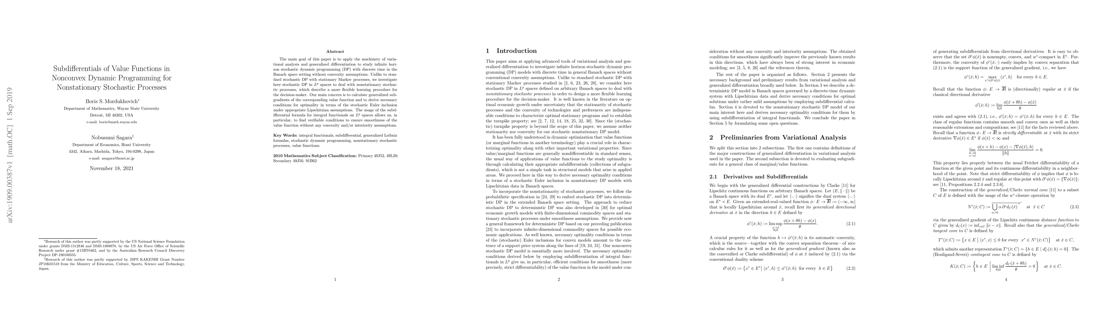 The main goal of this paper is to apply the machinery of variational analysis and generalized differentiation to study infinite horizon stochastic dynamic programming (DP) with discrete time in the Banach space setting without convexity assumptions. Unlike to standard stochastic DP with stationary Markov processes, we investigate here stochastic DP in $L^p$ spaces to deal with nonstationary stochastic processes, which describe a more flexible learning procedure for the decision-maker. Our main concern is to calculate generalized subgradients of the corresponding value function and to derive necessary conditions for optimality in terms of the stochastic Euler inclusion under appropriate Lipschitzian assumptions. The usage of the subdifferential formula for integral functionals on $L^p$ spaces allows us, in particular, to find verifiable conditions to ensure smoothness of the value function without any convexity and/or interiority assumptions.