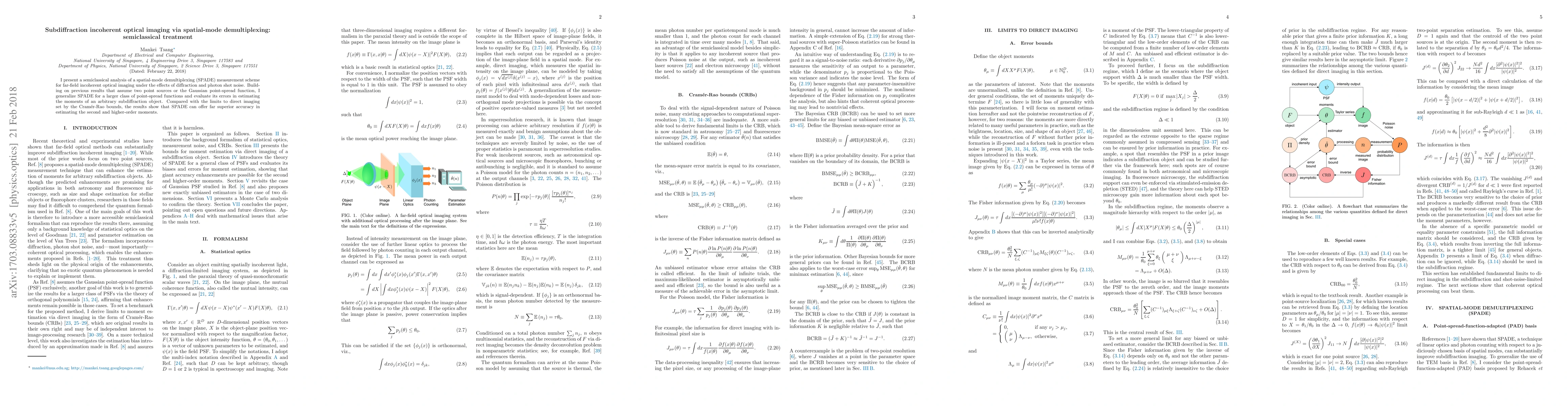 Title: Subdiffraction incoherent optical imaging via spatial-mode demultiplexing: semiclassical treatment Summary: This paper presents a semiclassical analysis of spatial-mode demultiplexing for subdiffraction incoherent optical imaging, showing that it can significantly improve accuracy in estimating higher-order moments of objects compared to direct imaging limits set by Cramér-Rao bounds.