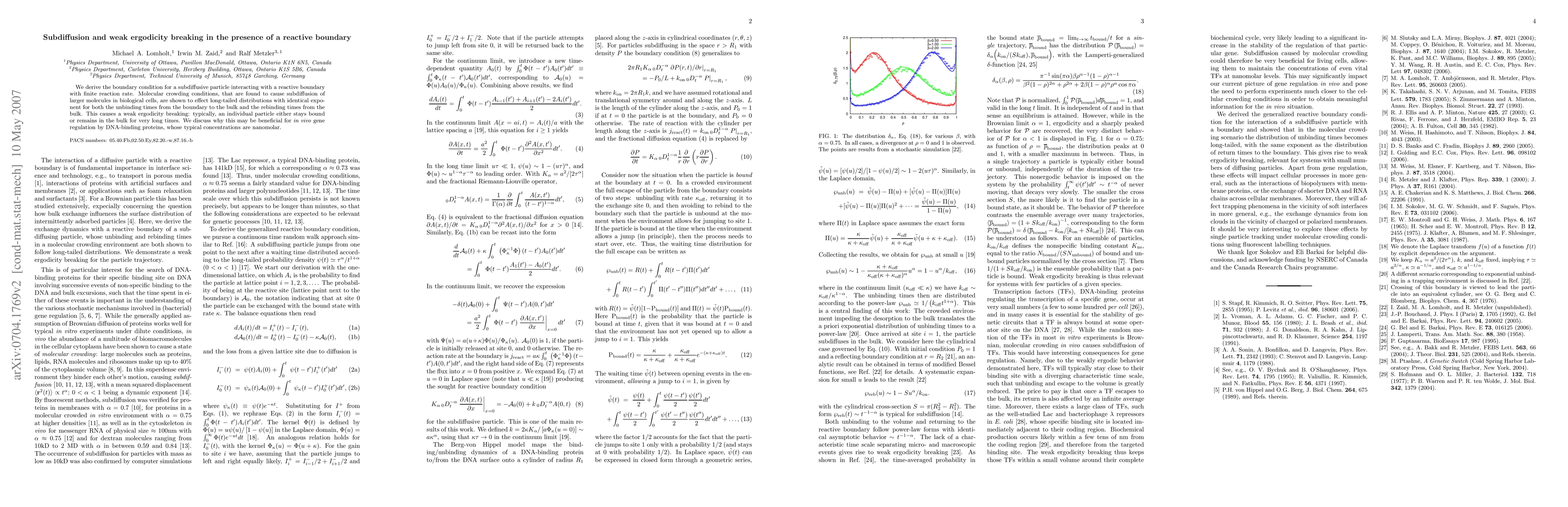 We derive the boundary condition for a subdiffusive particle interacting with a reactive boundary with finite reaction rate. Molecular crowding conditions, that are found to cause subdiffusion of larger molecules in biological cells, are shown to effect long-tailed distributions with identical exponent for both the unbinding times from the boundary to the bulk and the rebinding times from the bulk. This causes a weak ergodicity breaking: typically, an individual particle either stays bound or remains in the bulk for very long times. We discuss why this may be beneficial for in vivo gene regulation by DNA-binding proteins, whose typical concentrations are nanomolar