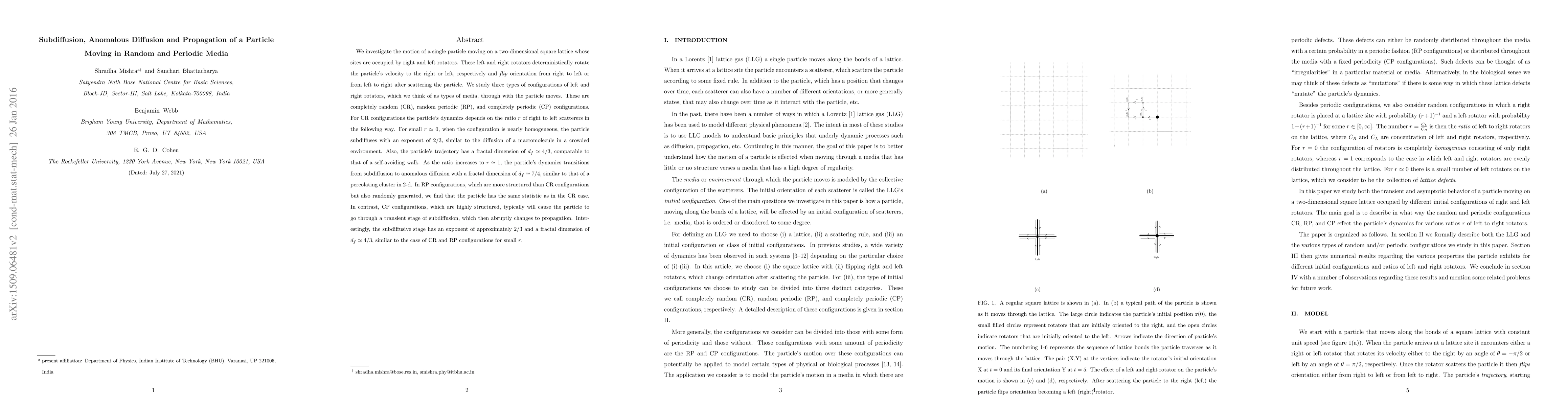 This paper studies the motion of a particle on a two-dimensional lattice with rotators that alter its velocity, examining subdiffusion, anomalous diffusion, and propagation in random and periodic media configurations. The particle transitions from subdiffusion to anomalous diffusion in random configurations, while periodic structures lead to transient subdiffusion followed by abrupt propagation.