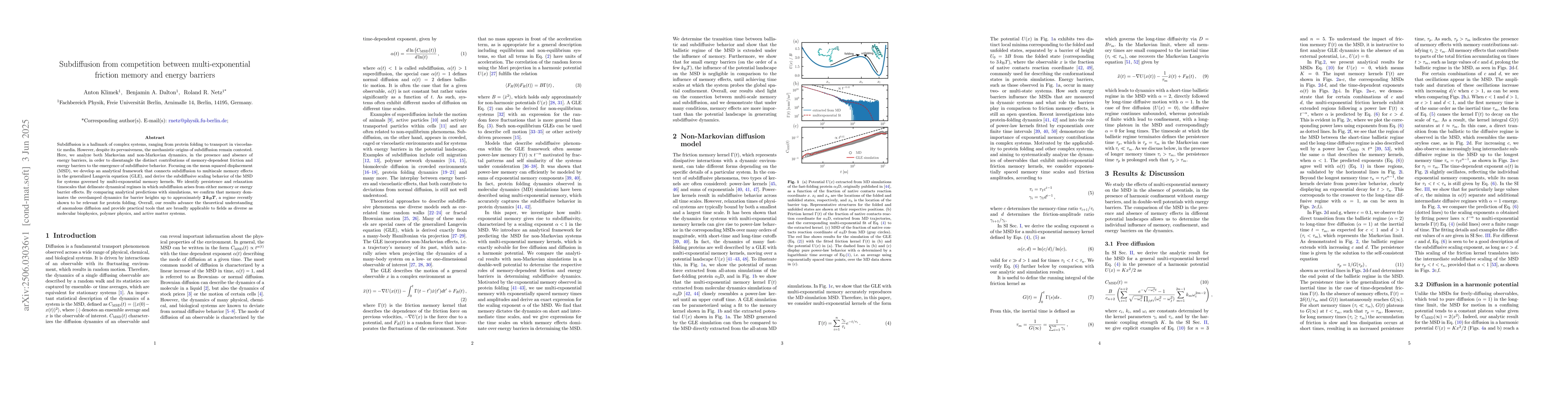 This work distinguishes itself by disentangling the contributions of memory-dependent friction and energy barriers to subdiffusion, providing a comprehensive analysis of dynamical regimes and their respective origins.