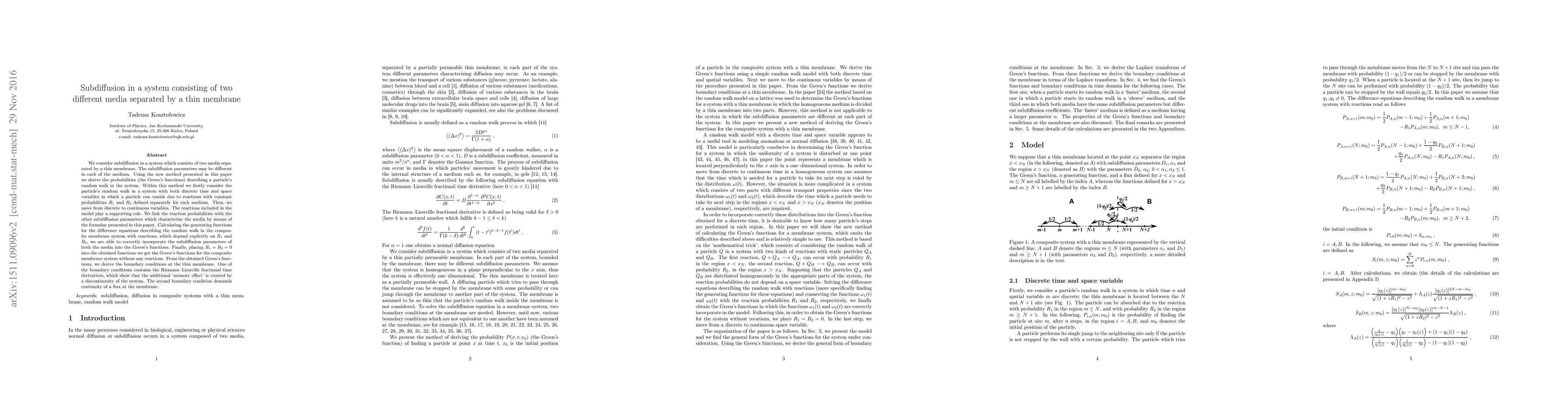 This paper explores subdiffusion in a system of two distinct media separated by a thin membrane, deriving Green's functions that describe particle movement. It introduces a new method to incorporate reaction probabilities and subdiffusion parameters, revealing a "memory effect" characterized by a Riemann-Liouville fractional time derivative in the boundary conditions.