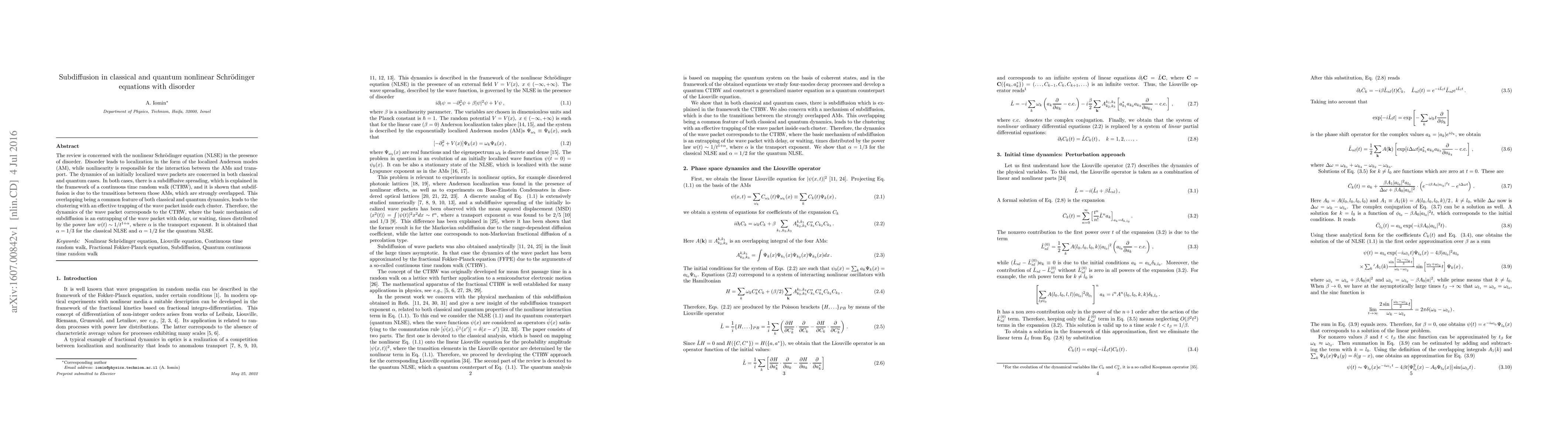 The review is concerned with the nonlinear Schr\"odinger equation (NLSE) in the presence of disorder. Disorder leads to localization in the form of the localized Anderson modes (AM), while nonlinearity is responsible for the interaction between the AMs and transport. The dynamics of an initially localized wave packets are concerned in both classical and quantum cases. In both cases, there is a subdiffusive spreading, which is explained in the framework of a continuous time random walk (CTRW), and it is shown that subdiffusion is due to the transitions between those AMs, which are strongly overlapped. This overlapping being a common feature of both classical and quantum dynamics, leads to the clustering with an effective trapping of the wave packet inside each cluster. Therefore, the dynamics of the wave packet corresponds to the CTRW, where the basic mechanism of subdiffusion is an entrapping of the wave packet with delay, or waiting, times distributed by the power law $w(t)\sim 1/t^{1+\alpha}$, where $\alpha$ is the transport exponent. It is obtained that $\alpha=1/3$ for the classical NLSE and $\alpha=1/2$ for the quantum NLSE.