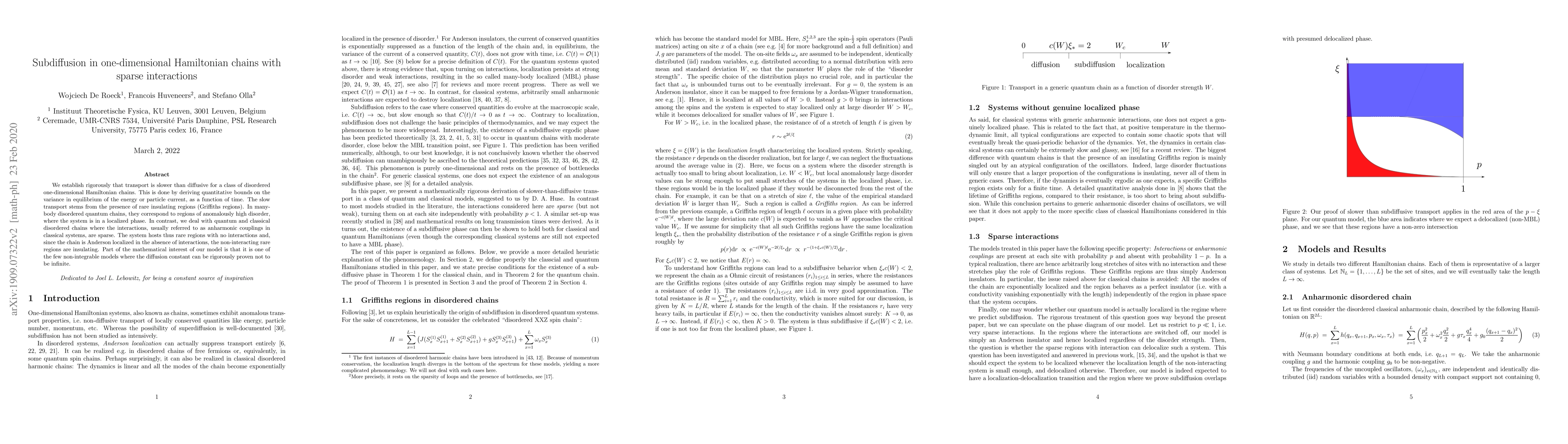 We establish rigorously that transport is slower than diffusive for a class of disordered one-dimensional Hamiltonian chains. This is done by deriving quantitative bounds on the variance in equilibrium of the energy or particle current, as a function of time. The slow transport stems from the presence of rare insulating regions (Griffiths regions). In many-body disordered quantum chains, they correspond to regions of anomalously high disorder, where the system is in a localized phase. In contrast, we deal with quantum and classical disordered chains where the interactions, usually referred to as anharmonic couplings in classical systems, are sparse. The system hosts thus rare regions with no interactions and, since the chain is Anderson localized in the absence of interactions, the non-interacting rare regions are insulating. Part of the mathematical interest of our model is that it is one of the few non-integrable models where the diffusion constant can be rigorously proven not to be infinite.