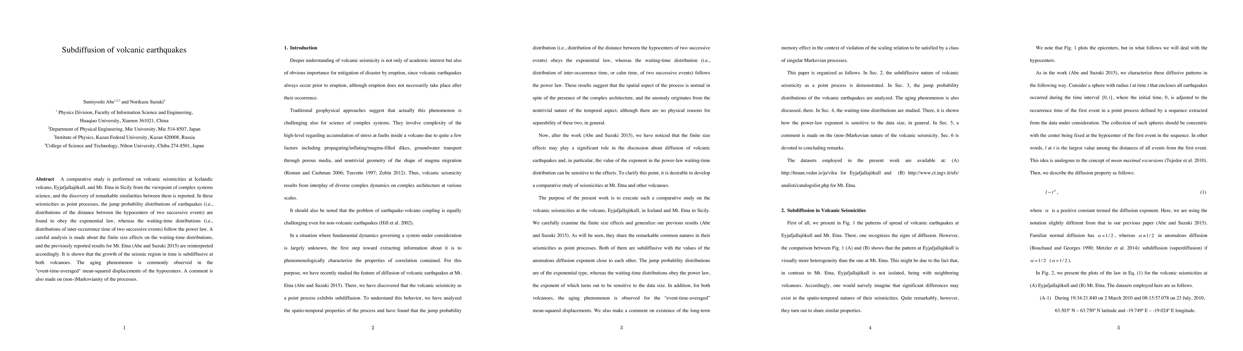 Volcanic earthquakes at Eyjafjallajokull and Mt Etna show subdiffusive growth, with waiting-time distributions following a power law and jump probability distributions obeying an exponential law. This discovery highlights the aging phenomenon and commonality in seismic processes between two distinct volcanoes.