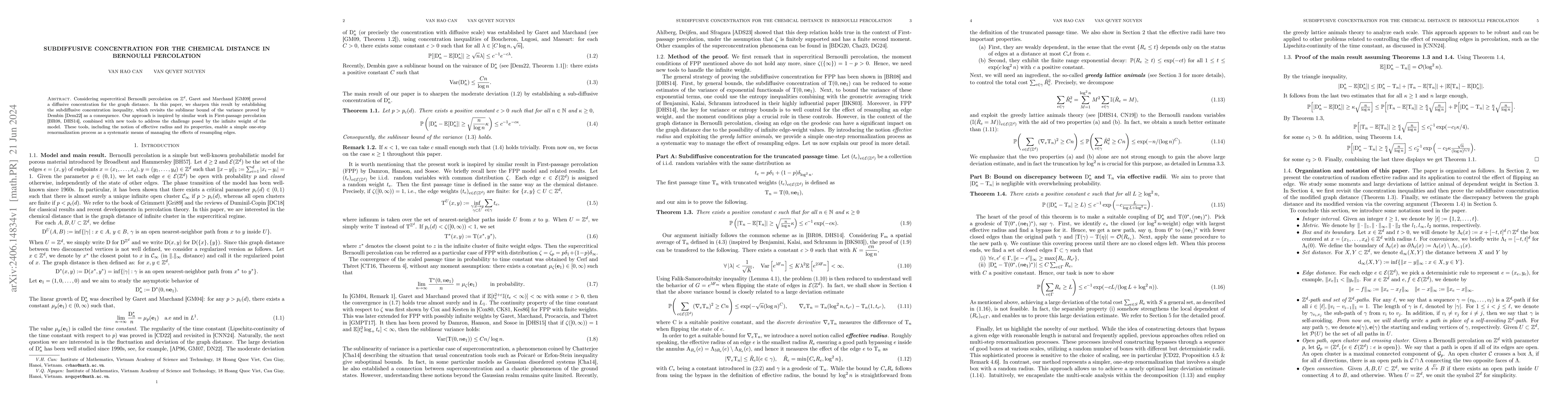 This paper establishes subdiffusive concentration for the chemical distance in supercritical Bernoulli percolation on $\mathbb{Z}^d$, improving upon previous results on graph distance concentration. It employs new tools like effective radius and a renormalization process to manage the model's infinite weight challenges.