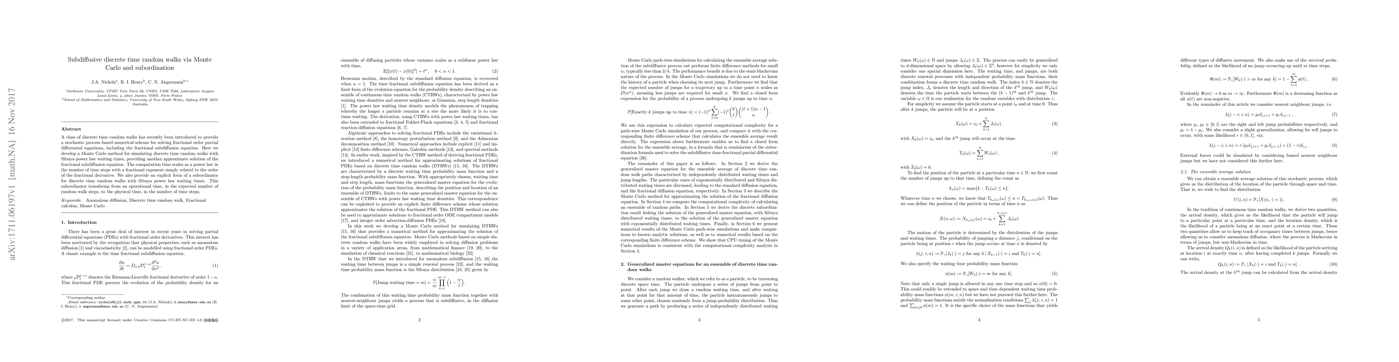This paper introduces a Monte Carlo method for simulating discrete time random walks with Sibuya power law waiting times, offering a numerical solution for fractional subdiffusion equations. The method's computation time scales as a power law, and it provides an explicit subordinator for transforming operational time to physical time.