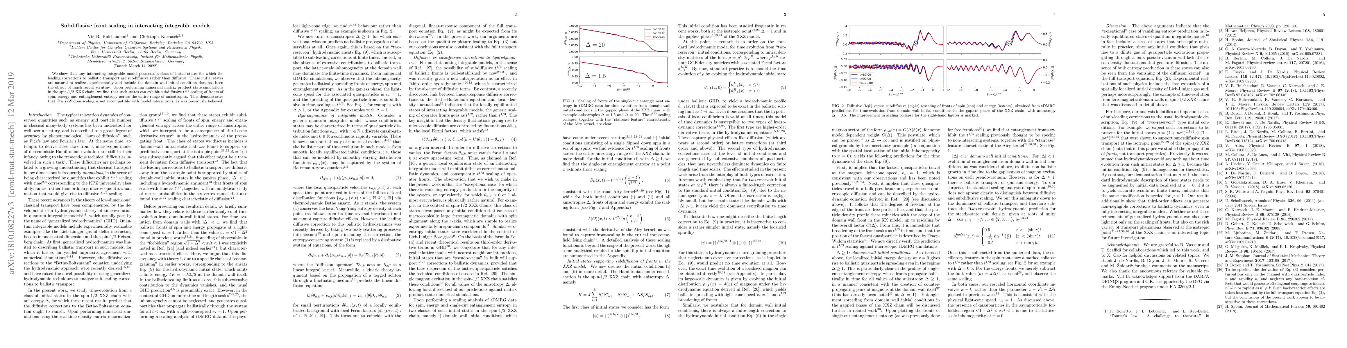 We show that any interacting integrable model possesses a class of initial states for which the leading corrections to ballistic transport are subdiffusive rather than diffusive. These initial states are natural to realize experimentally and include the domain wall initial condition that has been the object of much recent scrutiny. Upon performing numerical matrix product state simulations in the spin-$1/2$ XXZ chain, we find that such states can exhibit subdiffusive $t^{1/3}$ scaling of fronts of spin, energy and entanglement entropy across the entire range of anisotropies. This demonstrates that Tracy-Widom scaling is not incompatible with model interactions, as was previously believed.
