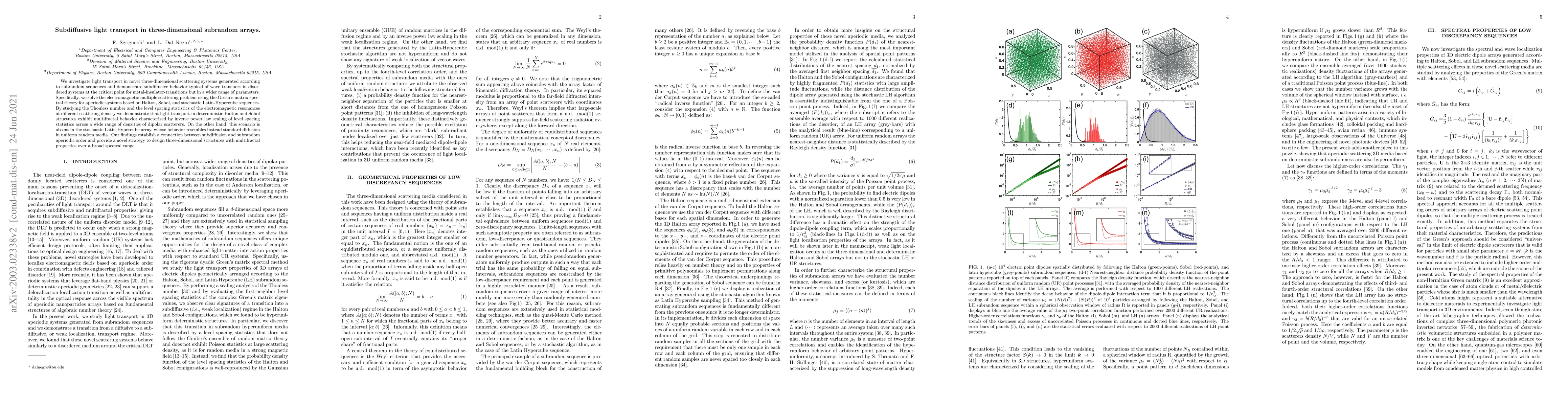 Researchers study light transport in 3D subrandom arrays, discovering multifractal behavior in deterministic structures with inverse power law scaling of level spacing statistics. This finding connects subdiffusion to subrandom aperiodic order, enabling the design of novel structures with unique properties.