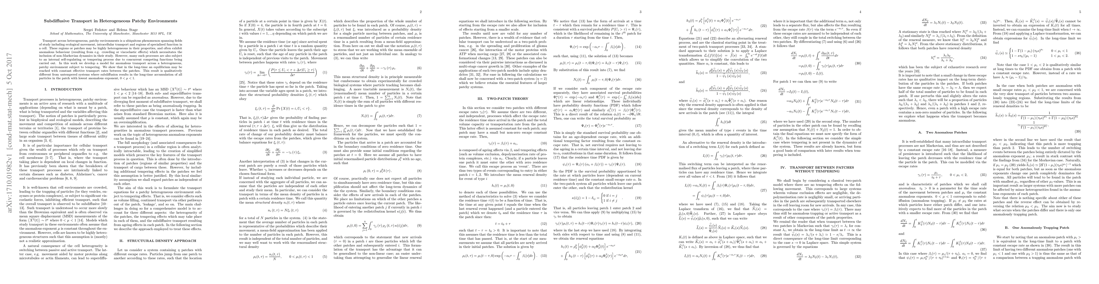 This research develops a model for anomalous transport in heterogeneous, patchy environments subject to self-regulating processes. It demonstrates that equilibrium with constant transport rates between patches can be achieved, contrasting with untempered systems where particles accumulate in the patch with the lowest anomalous exponent.