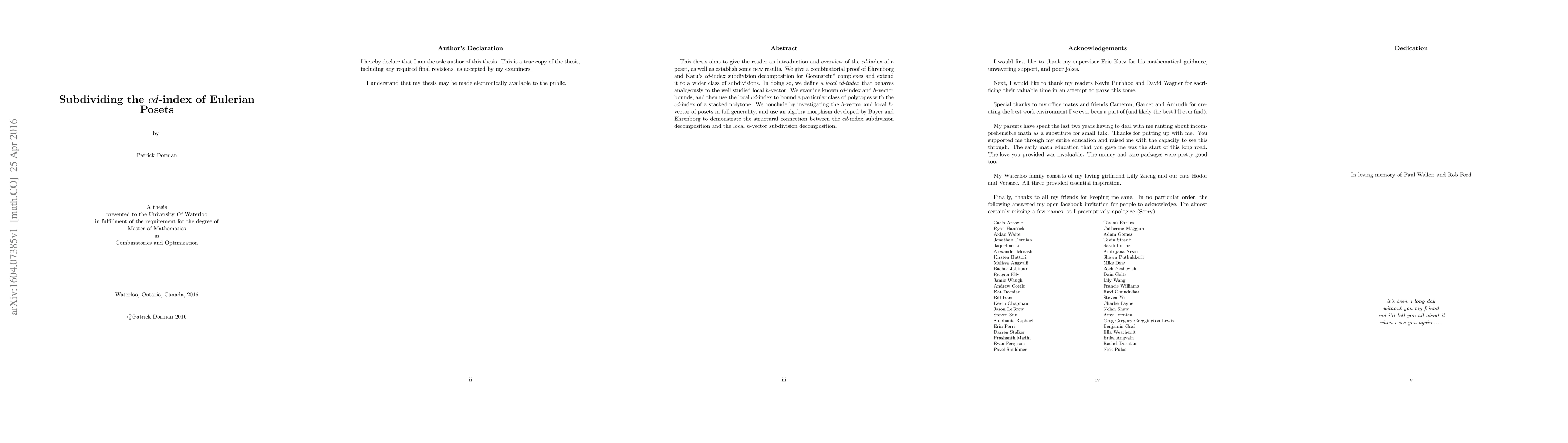 This thesis aims to give the reader an introduction and overview of the cd-index of a poset, as well as establish some new results. We give a combinatorial proof of Ehrenborg and Karu's cd-index subdivision decomposition for Gorenstein* complexes and extend it to a wider class of subdivisions. In doing so, we define a local cd-index that behaves analogously to the well studied local h-vector. We examine known cd-index and h-vector bounds, and then use the local cd-index to bound a particular class of polytopes with the cd-index of a stacked polytope. We conclude by investigating the h-vector and local h- vector of posets in full generality, and use an algebra morphism developed by Bayer and Ehrenborg to demonstrate the structural connection between the cd-index subdivision decomposition and the local h-vector subdivision decomposition. iii
