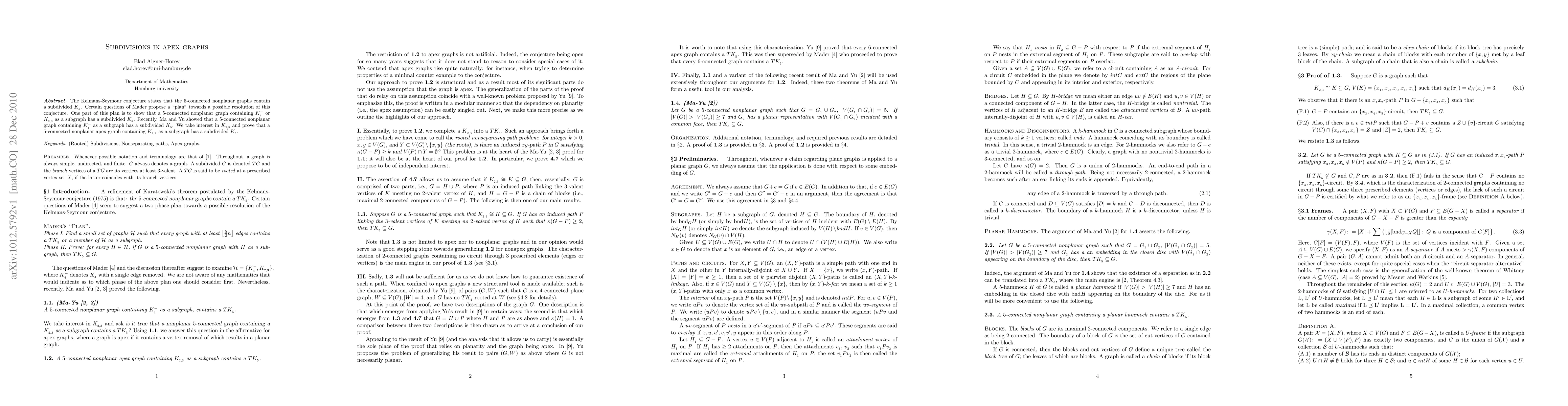 The Kelmans-Seymour conjecture states that the 5-connected nonplanar graphs contain a subdivided $K_{_5}$. Certain questions of Mader propose a "plan" towards a possible resolution of this conjecture. One part of this plan is to show that a 5-connected nonplanar graph containing $K^-_{_4}$ or $K_{_{2,3}}$ as a subgraph has a subdivided $K_{_5}$. Recently, Ma and Yu showed that a 5-connected nonplanar graph containing $K^-_{_4}$ as a subgraph has a subdivided $K_{_5}$. We take interest in $K_{_{2,3}}$ and prove that a 5-connected nonplanar apex graph containing $K_{_{2,3}}$ as a subgraph has a subdivided $K_{_5}$