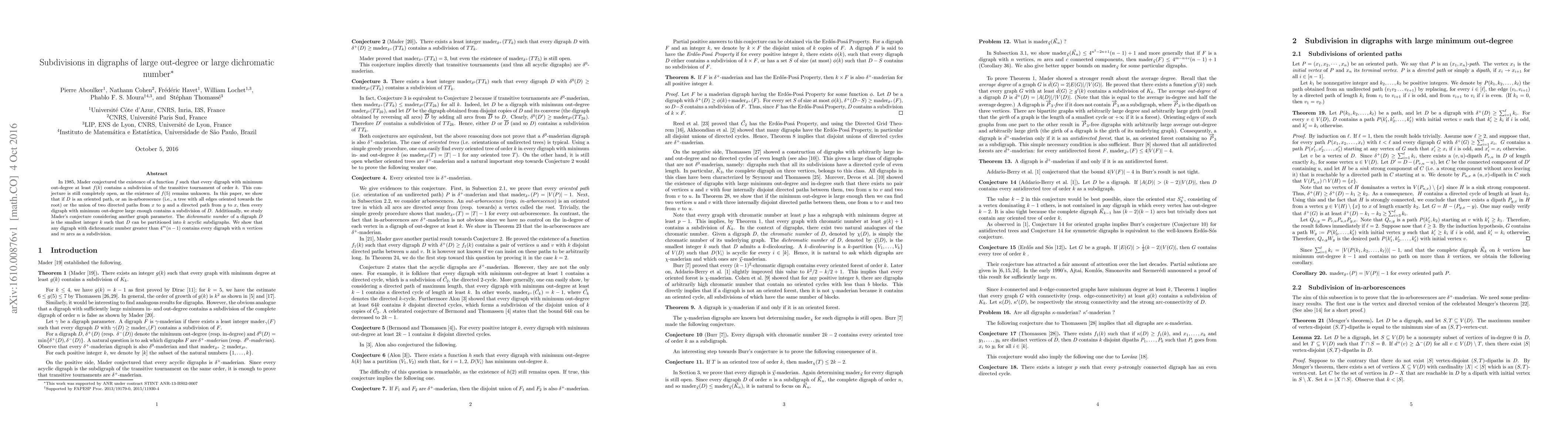 In 1985, Mader conjectured the existence of a function $f$ such that every digraph with minimum out-degree at least $f(k)$ contains a subdivision of the transitive tournament of order $k$. This conjecture is still completely open, as the existence of $f(5)$ remains unknown. In this paper, we show that if $D$ is an oriented path, or an in-arborescence (i.e., a tree with all edges oriented towards the root) or the union of two directed paths from $x$ to $y$ and a directed path from $y$ to $x$, then every digraph with minimum out-degree large enough contains a subdivision of $D$. Additionally, we study Mader's conjecture considering another graph parameter. The dichromatic number of a digraph $D$ is the smallest integer $k$ such that $D$ can be partitioned into $k$ acyclic subdigraphs. We show that any digraph with dichromatic number greater than $4^m (n-1)$ contains every digraph with $n$ vertices and $m$ arcs as a subdivision.