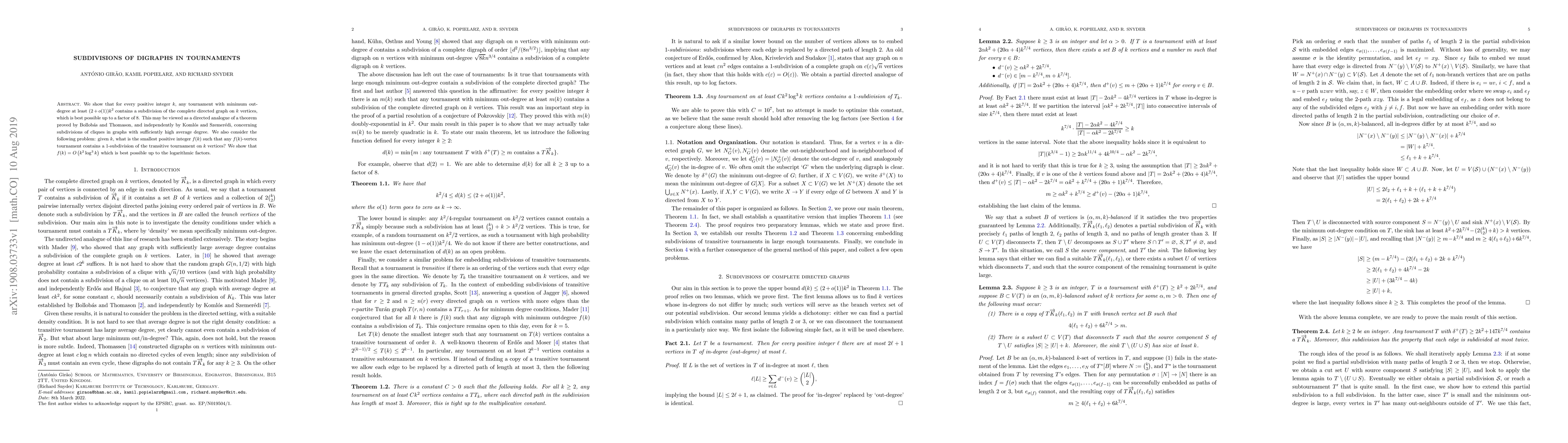 Researchers show that a certain type of tournament graph contains a subdivision of a complete graph with a minimum number of vertices proportional to the size of the tournament. They also establish an upper bound on the minimum number of vertices required for this property.