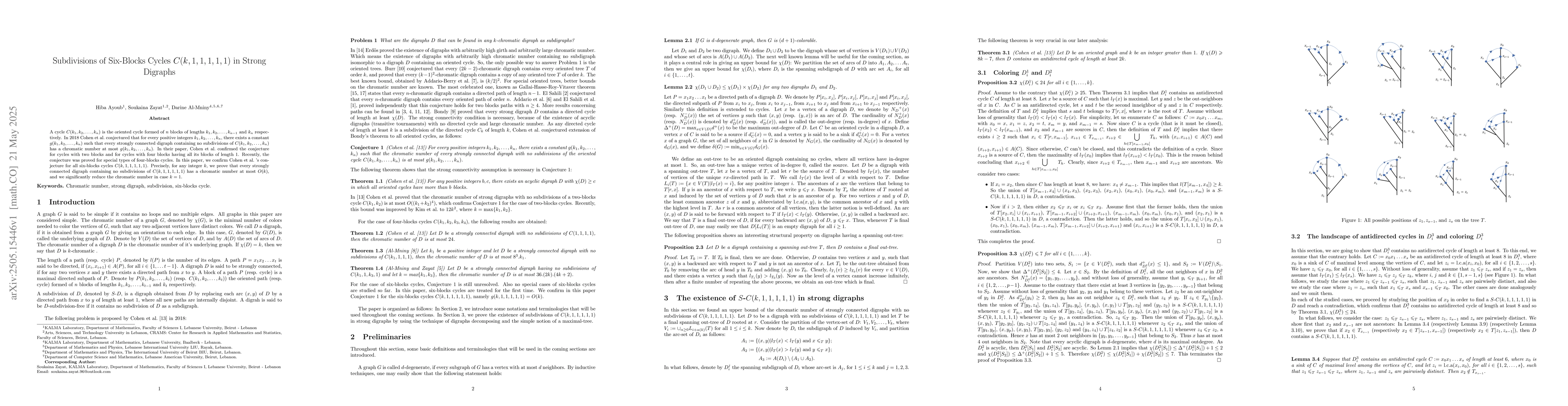 Researchers confirm Cohen et al.'s conjecture for six-blocks cycles in strongly connected digraphs, proving that every graph without a C(k,1,1,1,1,1) subdivision has a chromatic number at most O(k).