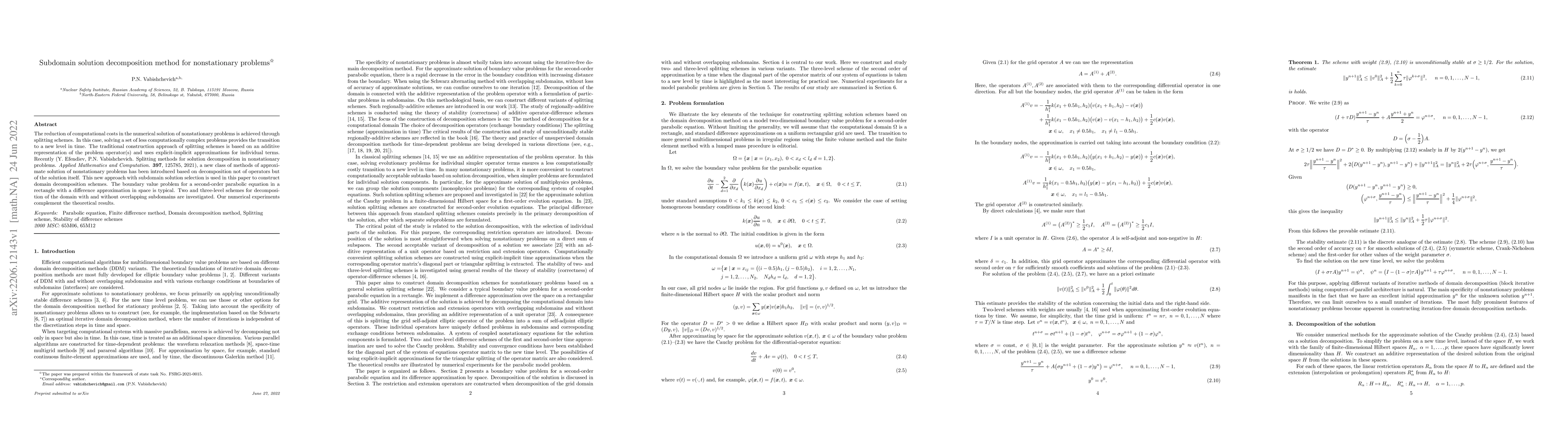 This paper introduces a novel subdomain solution decomposition method for solving nonstationary problems, aiming to reduce computational costs. It employs a new approach that decomposes the solution rather than the problem operator, constructing domain decomposition schemes with two and three-level schemes, including overlapping subdomains. Numerical experiments validate the theoretical findings.