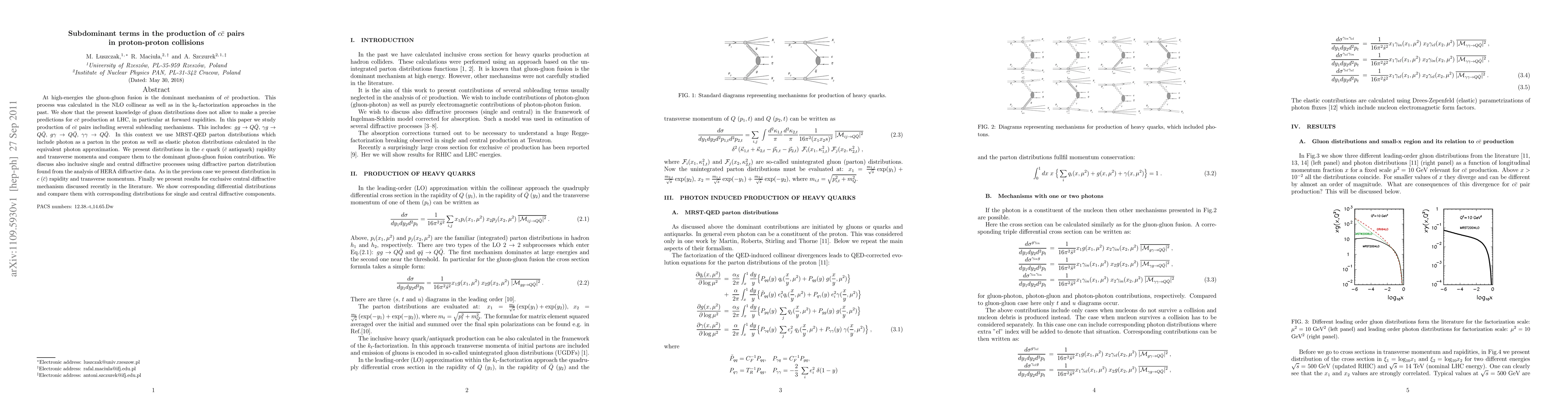 This paper investigates the production of $c \bar c$ pairs in proton-proton collisions at high energies, focusing on subdominant mechanisms beyond the dominant gluon-gluon fusion. It presents distributions in $c$ quark rapidity and transverse momentum, comparing subleading processes to the main contribution and discussing inclusive and exclusive diffractive mechanisms.