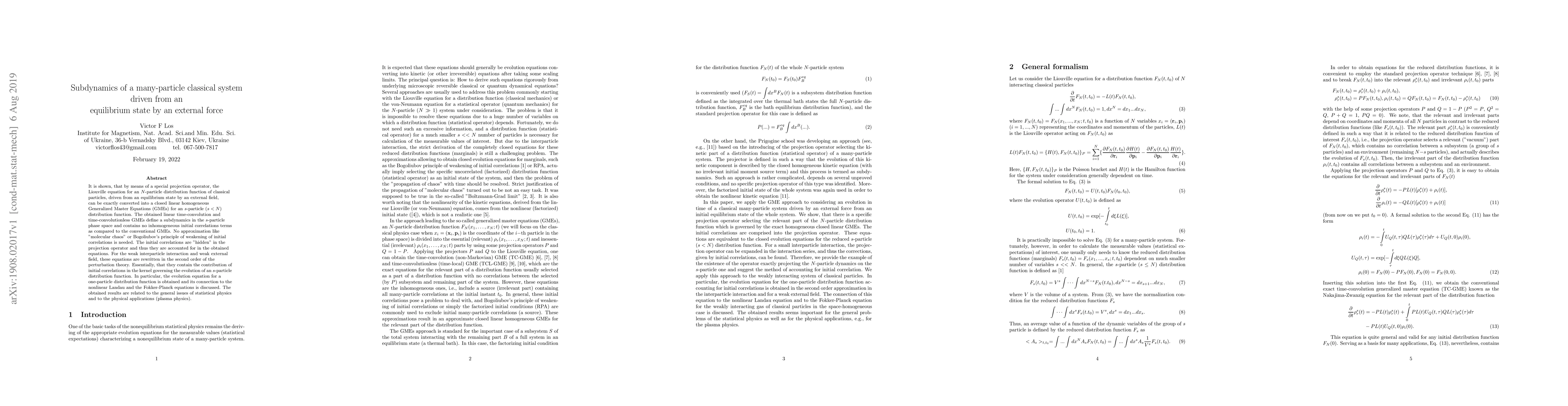 This paper develops a method to derive exact closed linear Generalized Master Equations (GMEs) for a subdynamics of s-particles in a many-particle system driven from equilibrium by an external force, without requiring approximations like "molecular chaos." The derived GMEs incorporate initial correlations, and for weak interactions, they are expressed in second-order perturbation theory, linking to the Landau and Fokker-Planck equations and relevant to plasma physics.