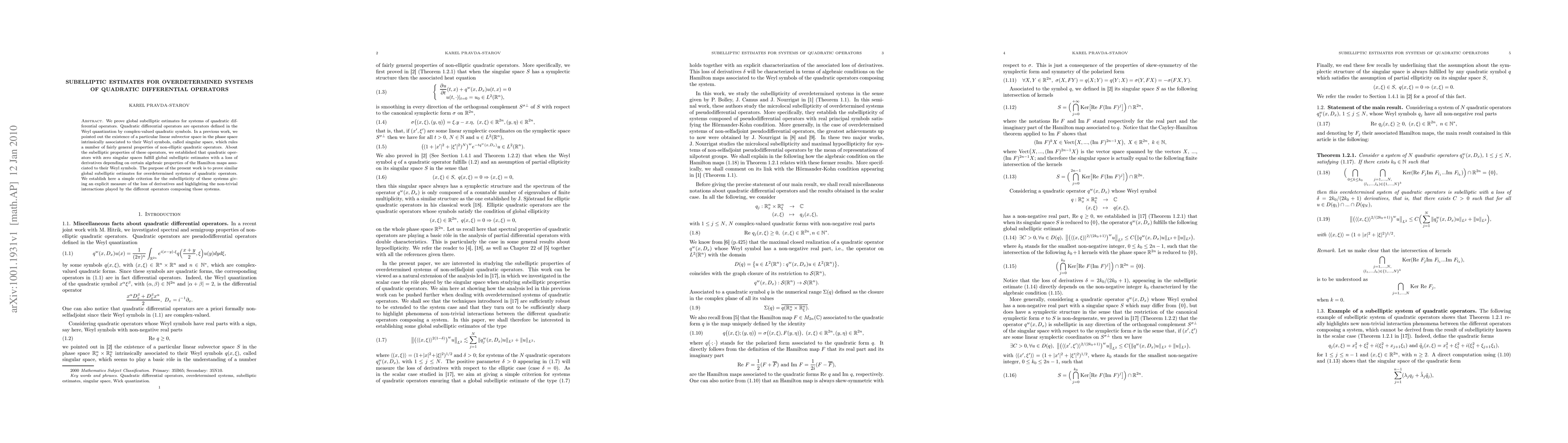 This paper proves global subelliptic estimates for overdetermined systems of quadratic differential operators, extending previous results on single operators. It introduces a criterion for subellipticity, quantifying the loss of derivatives based on the algebraic properties of Hamilton maps.
