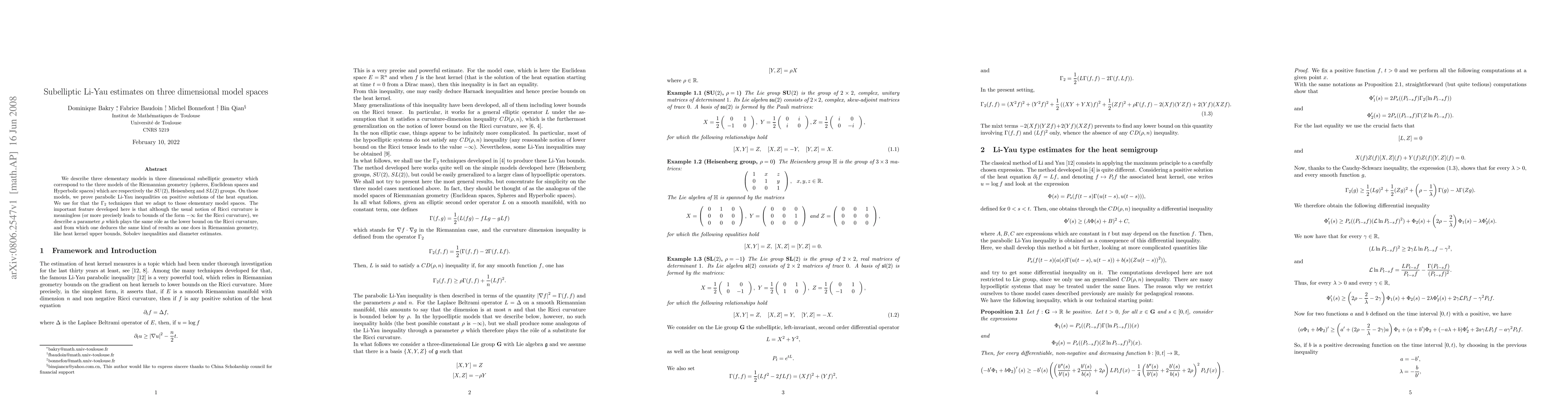 We describe three elementary models in three dimensional subelliptic geometry which correspond to the three models of the Riemannian geometry (spheres, Euclidean spaces and Hyperbolic spaces) which are respectively the SU(2), Heisenberg and SL(2) groups. On those models, we prove parabolic Li-Yau inequalities on positive solutions of the heat equation. We use for that the $\Gamma_{2}$ techniques that we adapt to those elementary model spaces. The important feature developed here is that although the usual notion of Ricci curvature is meaningless (or more precisely leads to bounds of the form $-\infty$ for the Ricci curvature), we describe a parameter $\rho$ which plays the same role as the lower bound on the Ricci curvature, and from which one deduces the same kind of results as one does in Riemannian geometry, like heat kernel upper bounds, Sobolev inequalities and diameter estimates.