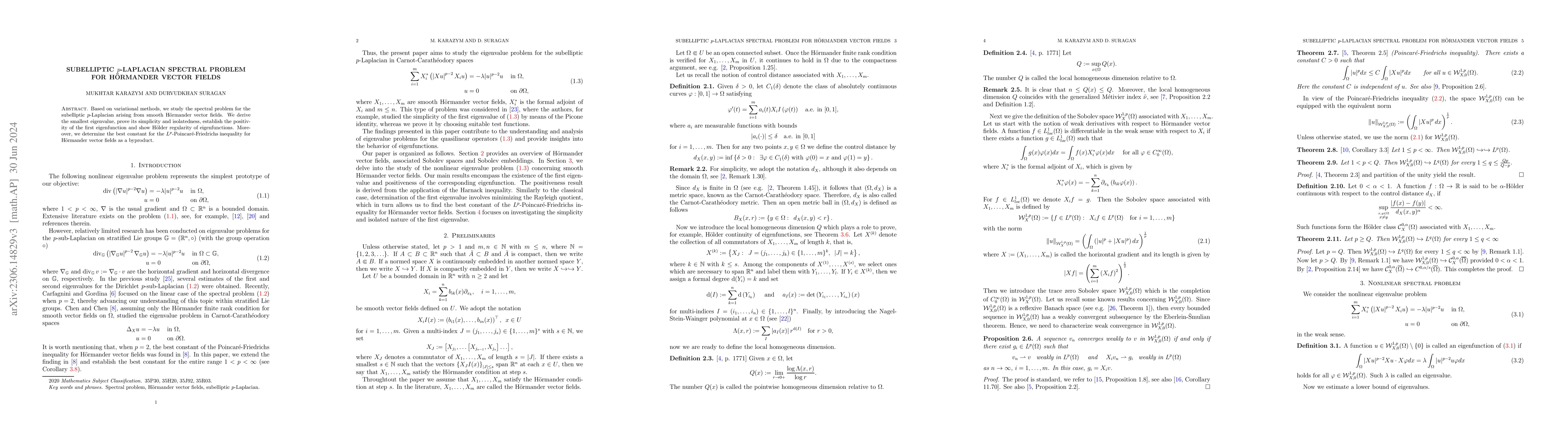 This paper uses variational methods to explore the spectral properties of the subelliptic $p$-Laplacian derived from smooth H\"ormander vector fields, deriving the smallest eigenvalue and proving its simplicity and isolatedness, while also establishing the positivity and H\"older regularity of eigenfunctions.