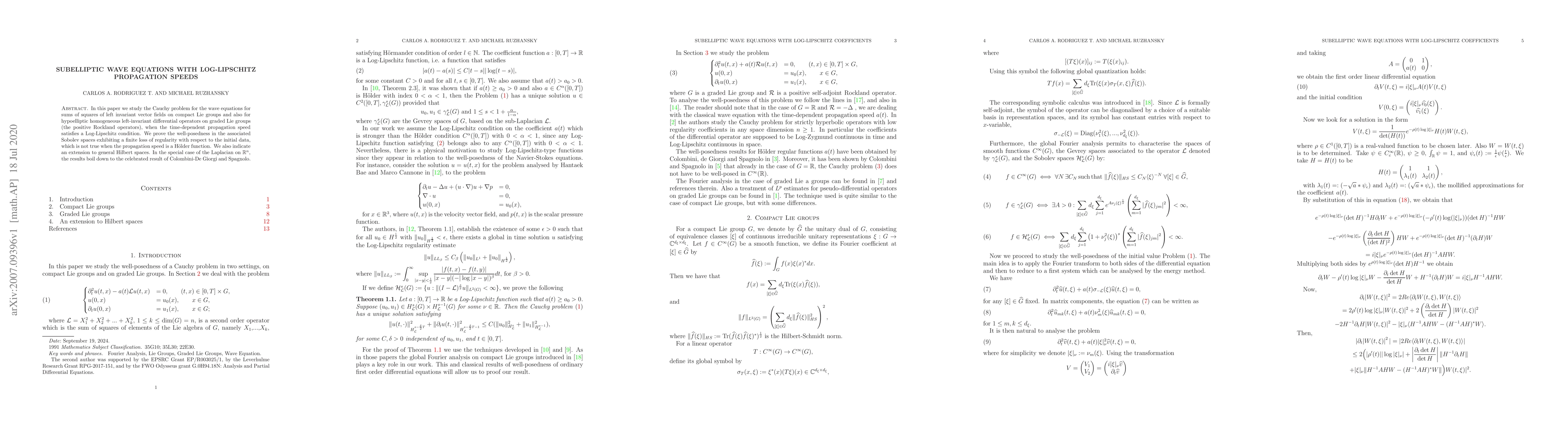 Researchers prove the well-posedness of subelliptic wave equations with Log-Lipschitz coefficients in compact Lie groups and graded Lie groups, showing a finite loss of regularity with respect to initial data.
