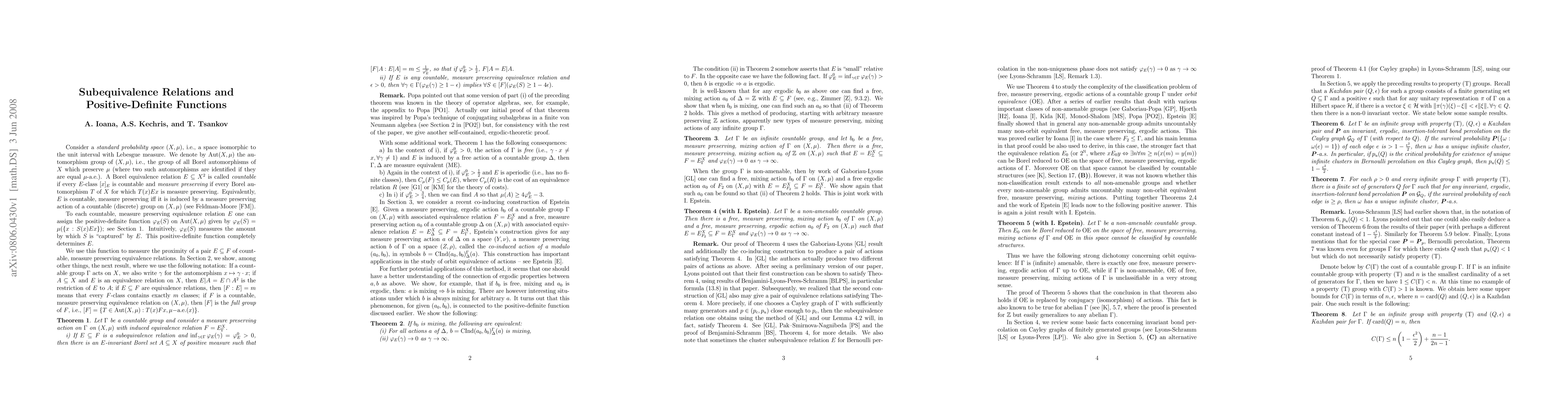 This paper investigates positive-definite functions linked to measure-preserving equivalence relations, employing them to quantify subequivalence relations' proximity and produce new mixing actions of infinite discrete groups. It demonstrates the unclassifiability of orbit equivalence for free, mixing actions of non-amenable groups.