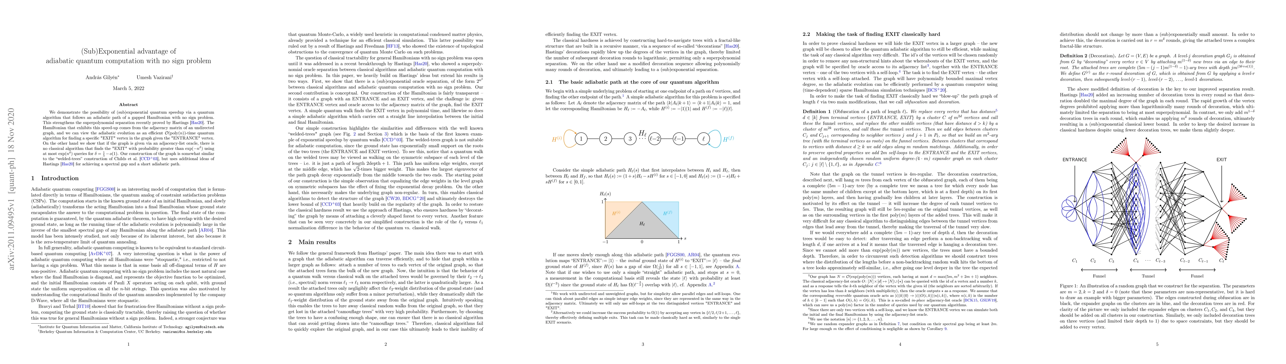 We demonstrate the possibility of (sub)exponential quantum speedup via a quantum algorithm that follows an adiabatic path of a gapped Hamiltonian with no sign problem. This strengthens the superpolynomial separation recently proved by Hastings. The Hamiltonian that exhibits this speed-up comes from the adjacency matrix of an undirected graph, and we can view the adiabatic evolution as an efficient $\mathcal{O}(\mathrm{poly}(n))$-time quantum algorithm for finding a specific "EXIT" vertex in the graph given the "ENTRANCE" vertex. On the other hand we show that if the graph is given via an adjacency-list oracle, there is no classical algorithm that finds the "EXIT" with probability greater than $\exp(-n^\delta)$ using at most $\exp(n^\delta)$ queries for $\delta= \frac15 - o(1)$. Our construction of the graph is somewhat similar to the "welded-trees" construction of Childs et al., but uses additional ideas of Hastings for achieving a spectral gap and a short adiabatic path.