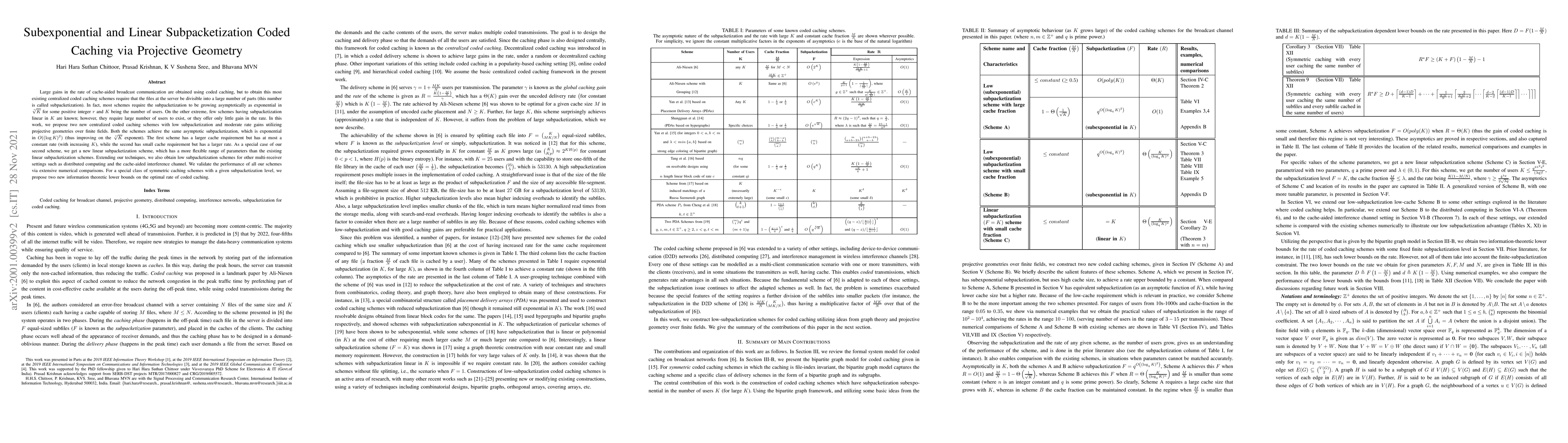 This paper proposes two new centralized coded caching schemes using projective geometry that achieve subexponential and linear subpacketization, respectively, improving upon the existing schemes that require exponential subpacketization. The first scheme offers moderate rate gains with a larger cache requirement, while the second provides a smaller cache requirement with a larger rate, including a special case with linear subpacketization.