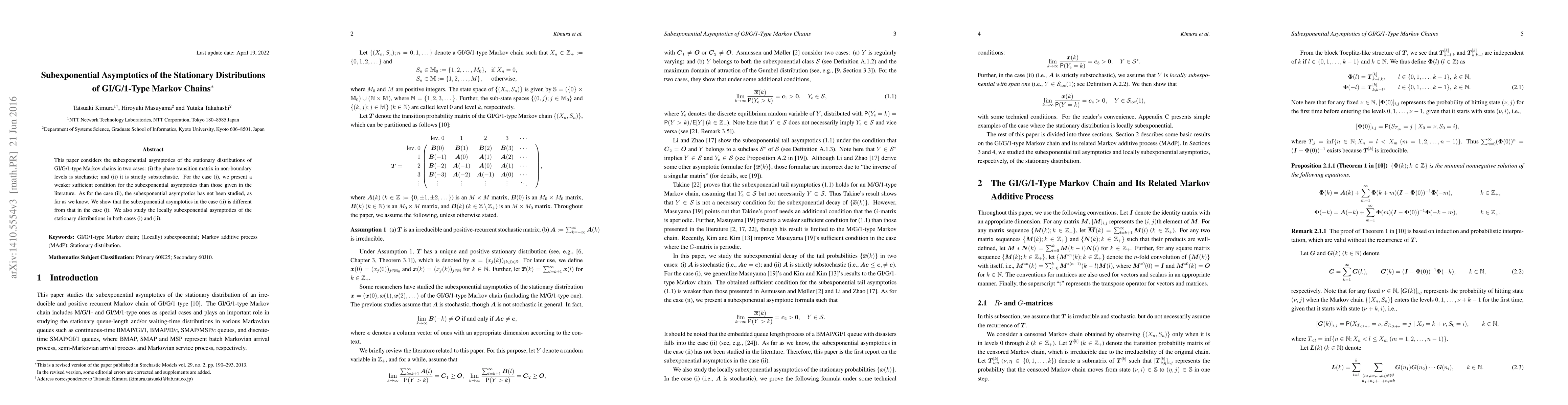 This paper considers the subexponential asymptotics of the stationary distributions of GI/G/1-type Markov chains in two cases: (i) the phase transition matrix in non-boundary levels is stochastic; and (ii) it is strictly substochastic. For the case (i), we present a weaker sufficient condition for the sub exponential asymptotics than those given in the literature. As for the case (ii), the subexponential asymptotics has not been studied, as far as we know. We show that the subexponential asymptotics in the case (ii) is different from that in the case (i). We also study the locally subexponential asymptotics of the stationary distributions in both cases (i) and (ii).