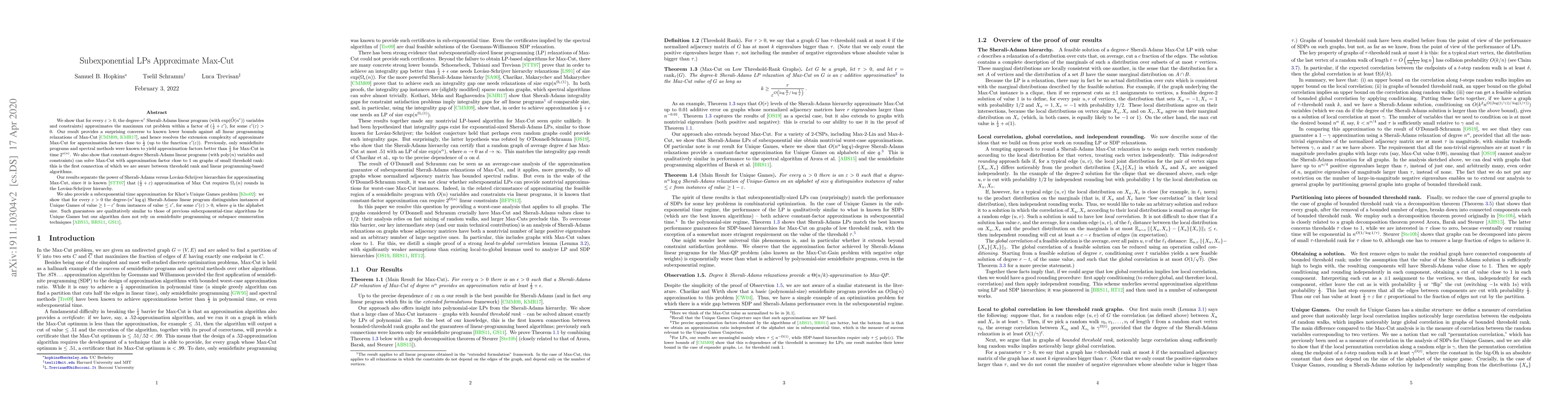 This paper demonstrates that subexponential Sherali-Adams linear programs can approximate Max-Cut within a factor of $(\frac{1}{2}+\varepsilon')$ for small $\varepsilon$, resolving the extension complexity for such approximation factors. It also connects threshold rank with linear programming for Max-Cut and provides a subexponential approximation for Khot's Unique Games problem without relying on semidefinite programming.