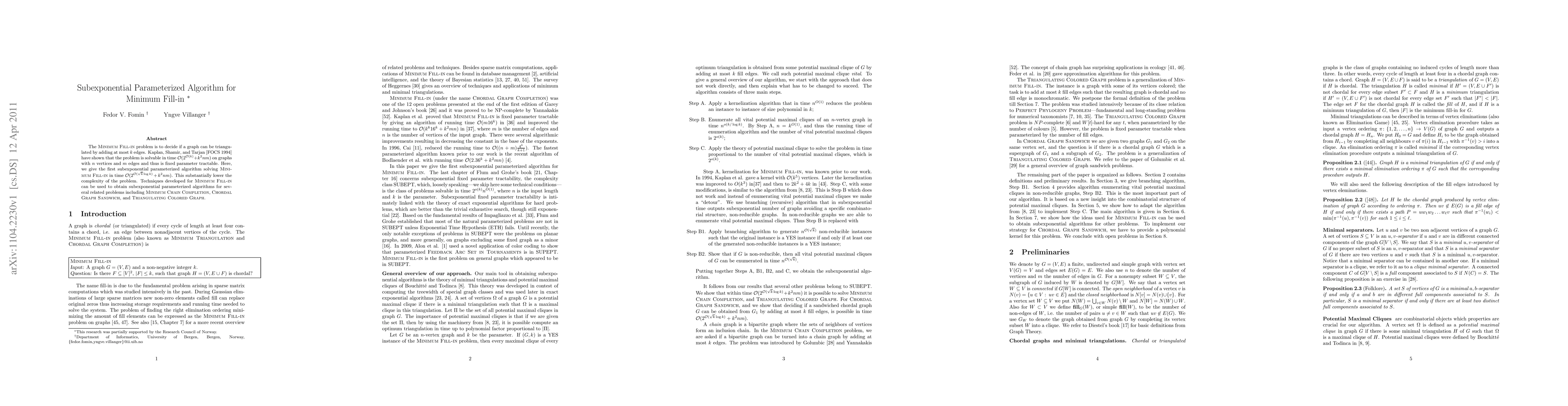 The Minimum Fill-in problem is to decide if a graph can be triangulated by adding at most k edges. Kaplan, Shamir, and Tarjan [FOCS 1994] have shown that the problem is solvable in time O(2^(O(k)) + k2 * nm) on graphs with n vertices and m edges and thus is fixed parameter tractable. Here, we give the first subexponential parameterized algorithm solving Minimum Fill-in in time O(2^(O(\sqrt{k} log k)) + k2 * nm). This substantially lower the complexity of the problem. Techniques developed for Minimum Fill-in can be used to obtain subexponential parameterized algorithms for several related problems including Minimum Chain Completion, Chordal Graph Sandwich, and Triangulating Colored Graph.