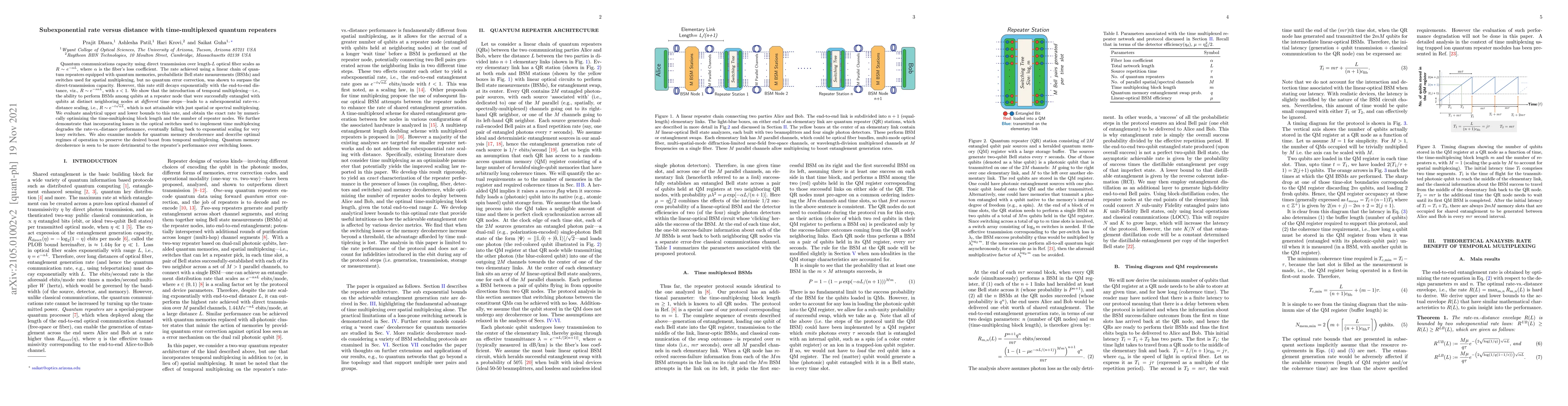 Quantum communications capacity using direct transmission over length-$L$ optical fiber scales as $R \sim e^{-\alpha L}$, where $\alpha$ is the fiber's loss coefficient. The rate achieved using a linear chain of quantum repeaters equipped with quantum memories, probabilistic Bell state measurements (BSMs) and switches used for spatial multiplexing, but no quantum error correction, was shown to surpass the direct-transmission capacity. However, this rate still decays exponentially with the end-to-end distance, viz., $R \sim e^{-s{\alpha L}}$, with $s < 1$. We show that the introduction of temporal multiplexing - i.e., the ability to perform BSMs among qubits at a repeater node that were successfully entangled with qubits at distinct neighboring nodes at {\em different} time steps - leads to a sub-exponential rate-vs.-distance scaling, i.e., $R \sim e^{-t\sqrt{\alpha L}}$, which is not attainable with just spatial or spectral multiplexing. We evaluate analytical upper and lower bounds to this rate, and obtain the exact rate by numerically optimizing the time-multiplexing block length and the number of repeater nodes. We further demonstrate that incorporating losses in the optical switches used to implement time multiplexing degrades the rate-vs.-distance performance, eventually falling back to exponential scaling for very lossy switches. We also examine models for quantum memory decoherence and describe optimal regimes of operation to preserve the desired boost from temporal multiplexing. Quantum memory decoherence is seen to be more detrimental to the repeater's performance over switching losses.