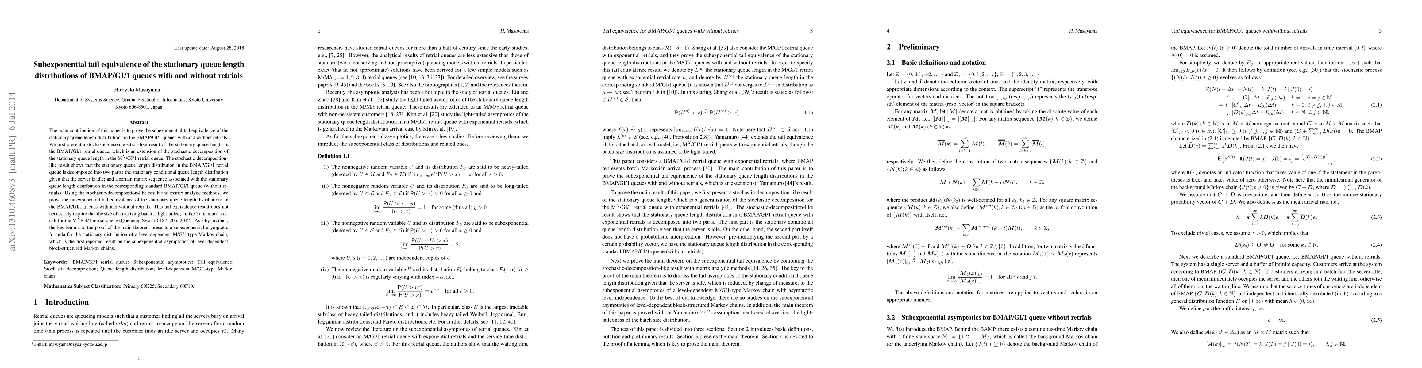 This paper proves the subexponential tail equivalence of queue length distributions in BMAP/GI/1 queues with and without retrials, using a stochastic-decomposition-like result and matrix analytic methods. It also introduces a subexponential asymptotic formula for level-dependent Markov chains.