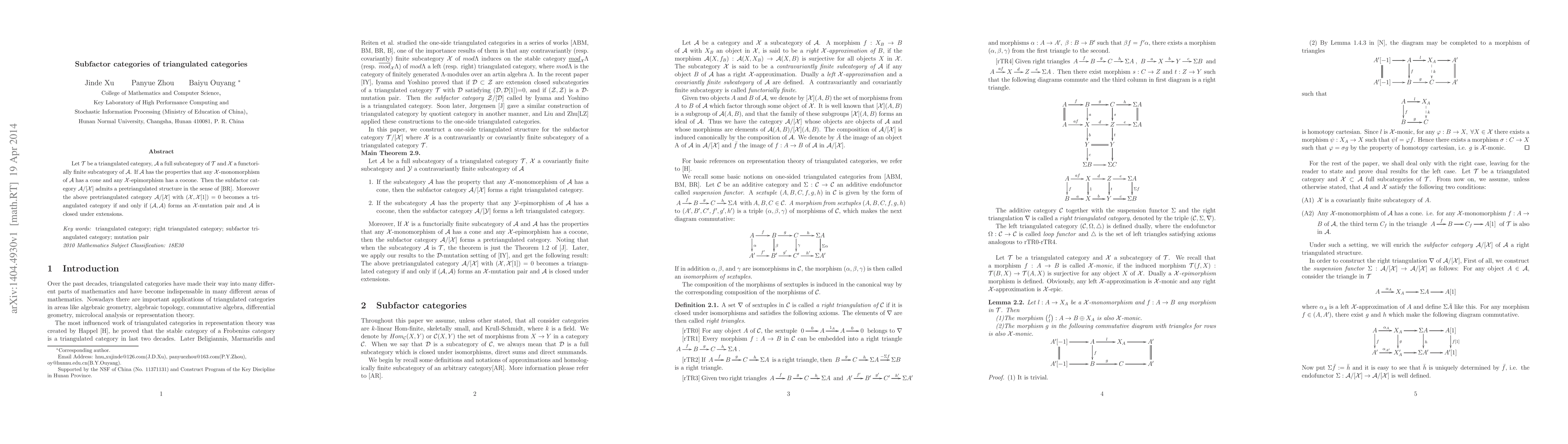 Let {\cal T} be a triangulated category, {\cal A} a full subcategory of {\cal T} and {\cal X} a functorially finite subcategory of {\cal A}. If {\cal A} has the properties that any {\cal X}-monomorphism of {\cal A} has a cone and any {\cal X}-epimorphism has a cocone. Then the subfactor category {\cal A/[X]} admits a pretriangulated structure in the sense of [BR]. Moreover the above pretriangulated category {\cal A/[X]} with ({\cal X},{\cal X}[1]) = 0 becomes a triangulated category if and only if ({\cal A},{\cal A}) forms an {\cal X}-mutation pair and {\cal A} is closed under extensions.