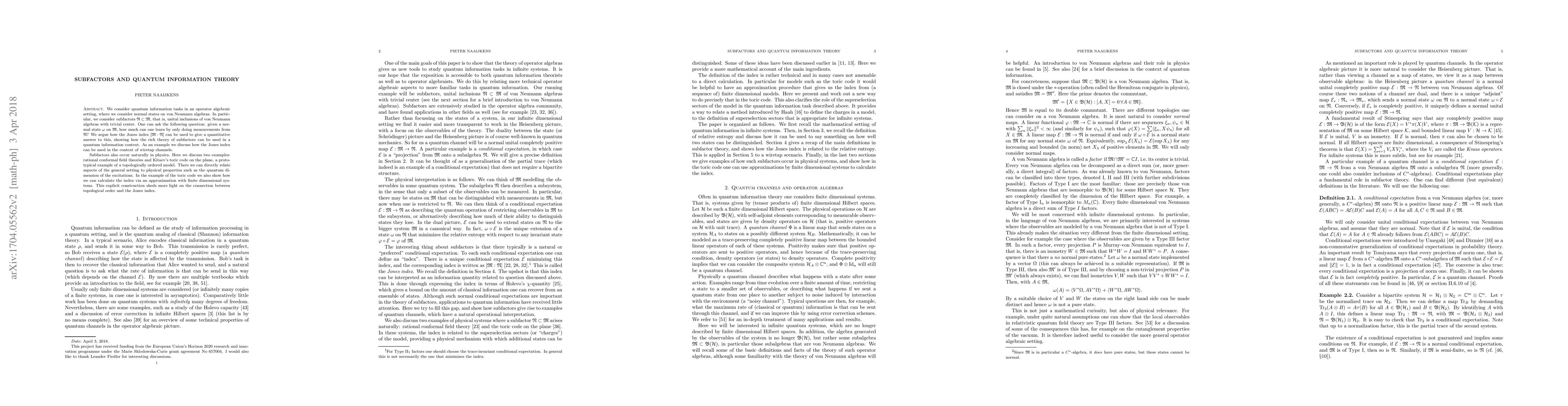 Researchers explore how quantum information can be extracted from subfactors in operator algebras, with potential applications to wiretap channels and topological order in physics.